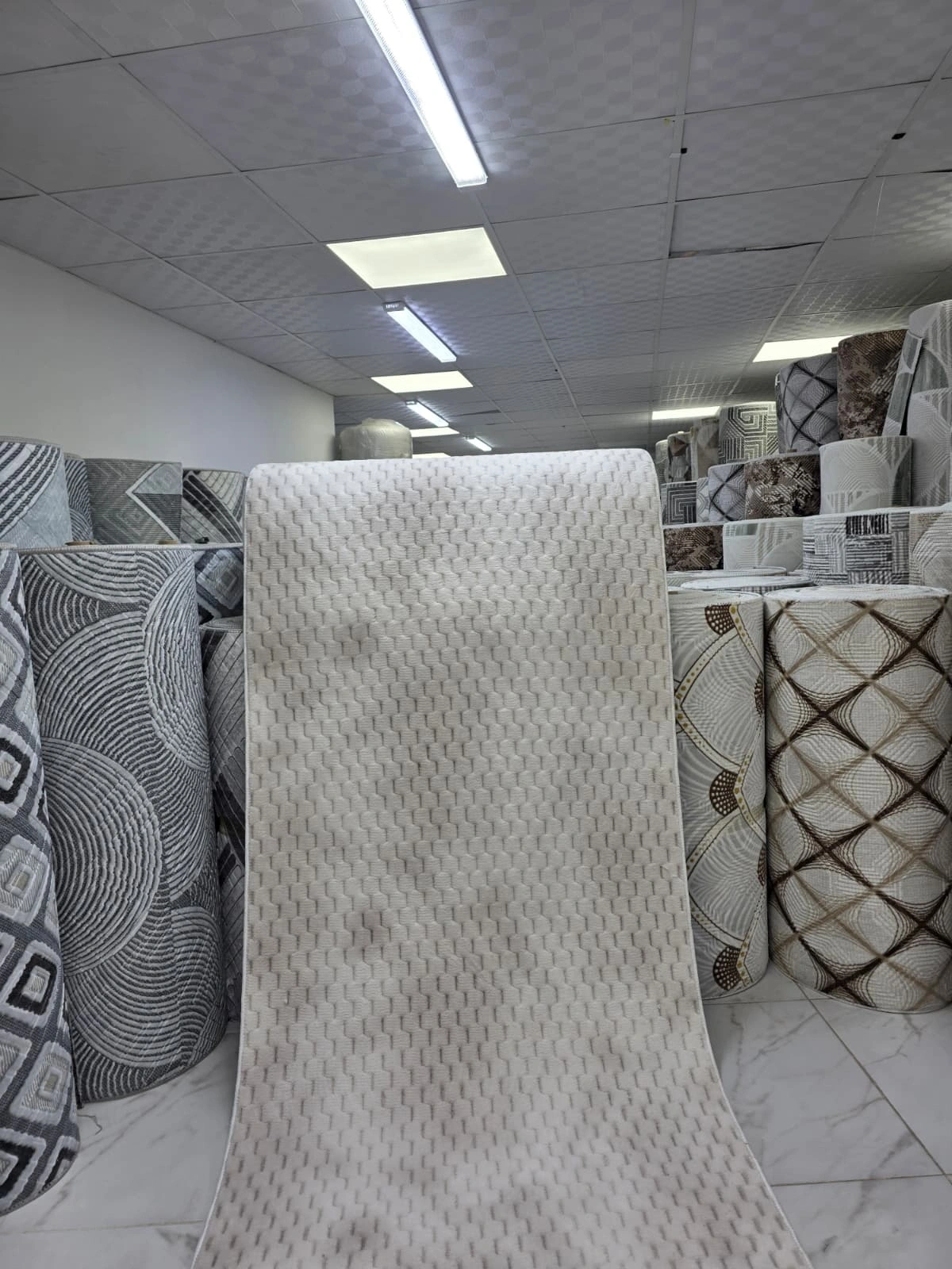 Aksu Krem Beyaz Sade Petek Kabartmalı Halı, krem-beyaz zemin üzerinde büyük petek motiflerinin oluşturduğu sade ve zarif üç boyutlu dokuyla minimalist lüksü en saf biçimiyle sunuyor. Temiz ve sade geometrik yapısı, beyaz-krem nötr tonu ve üç boyutlu petek dokusuyla her modern mekâna kolayca entegre olan bu halı, sade ve şık dekorasyon arayanların ilk tercihi. 900 TL fiyatıyla Türkiye genelinde kapıya teslim edilmektedir.