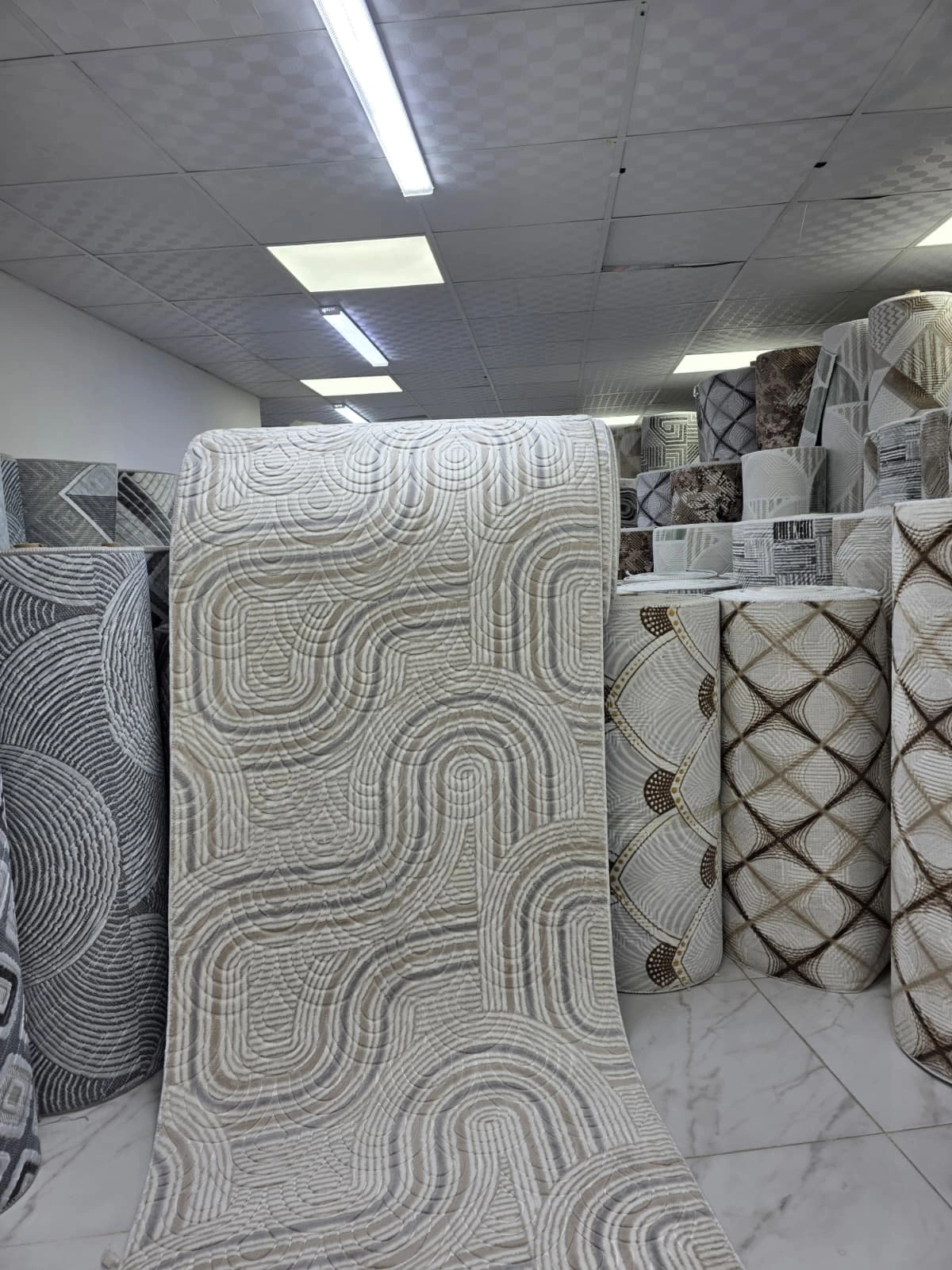 • Aksu Krem Petek modeli, krem-beyaz zemin üzerinde iç içe petek/balık pulu kabartma motiflerinin oluşturduğu üç boyutlu dokuma yüzeyiyle sade ama etkileyici bir lüks sunar. Işığın farklı açılardan düşmesiyle değişen gölge efekti ve zarif krem tonu, her tür dekorasyona mükemmel uyum sağlar.