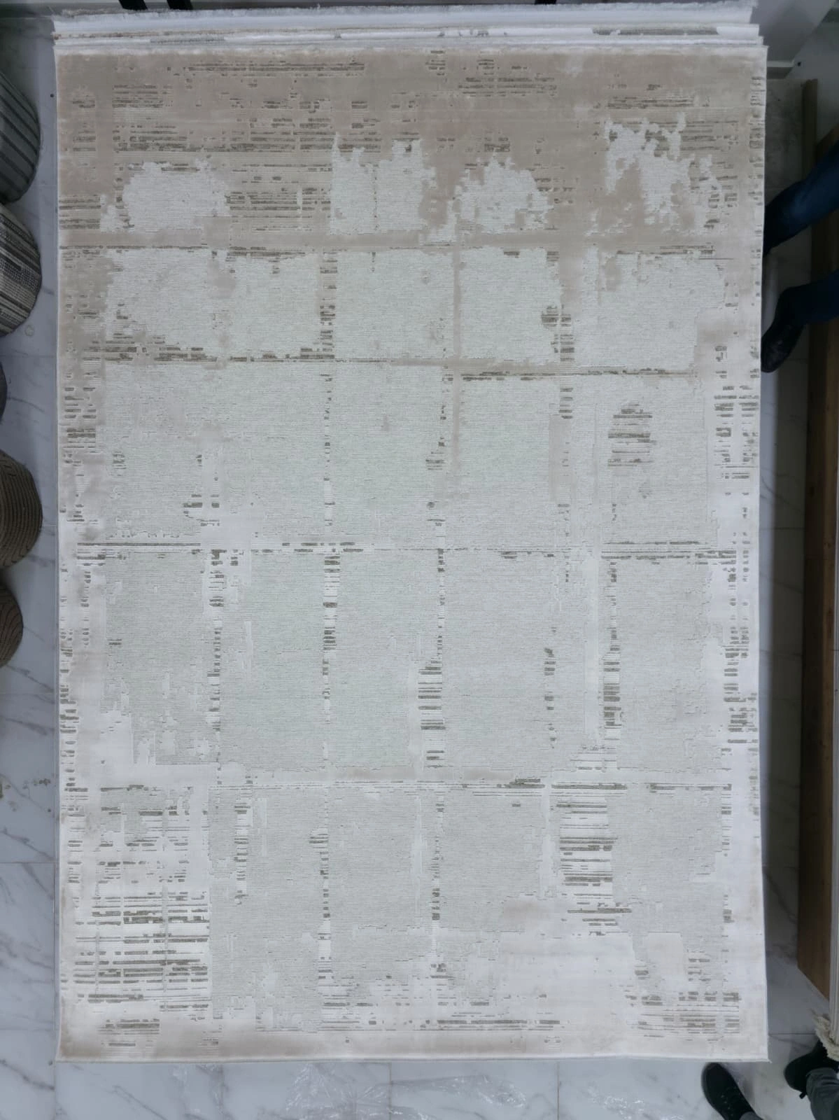 Apex Monoluxe 4042 model bej vintage blok desenli lüks halı. Bej zemin üzerinde dikdörtgen blok efektleri ve vintage doku detaylarıyla modern bohem tarzı mekânlara ideal bir seçimdir. 200x290 cm, kaymaz taban, anti-alerjik.