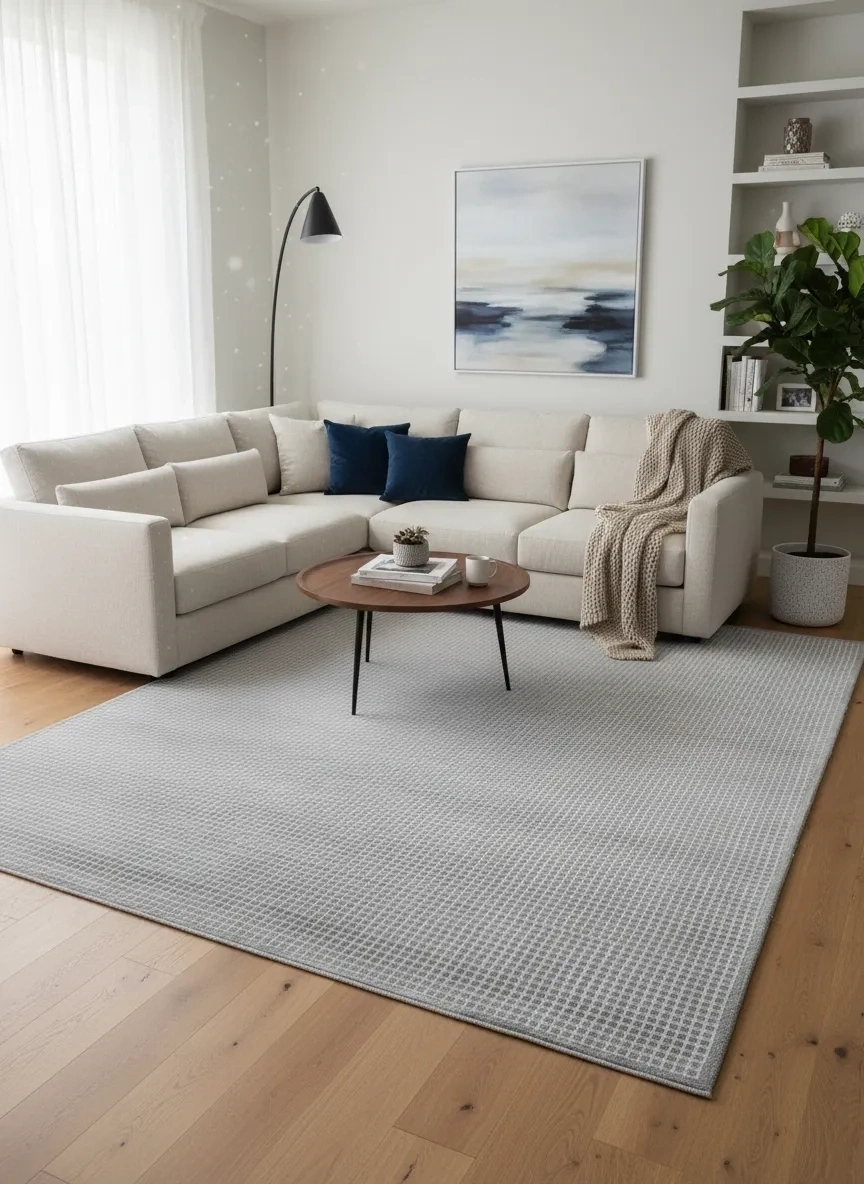 Apex Safran 8122SA model gri kareli dokulu modern halı. Açık gri tonu üzerinde belirgin kare doku deseni ve hafif renk geçişiyle modern iç mekânlara özgün bir katkı sağlar. 200x290 cm, kaymaz taban, uzun ömürlü.
