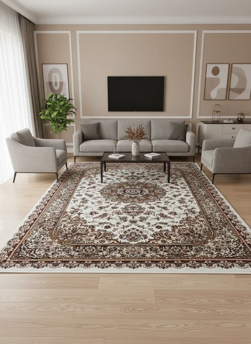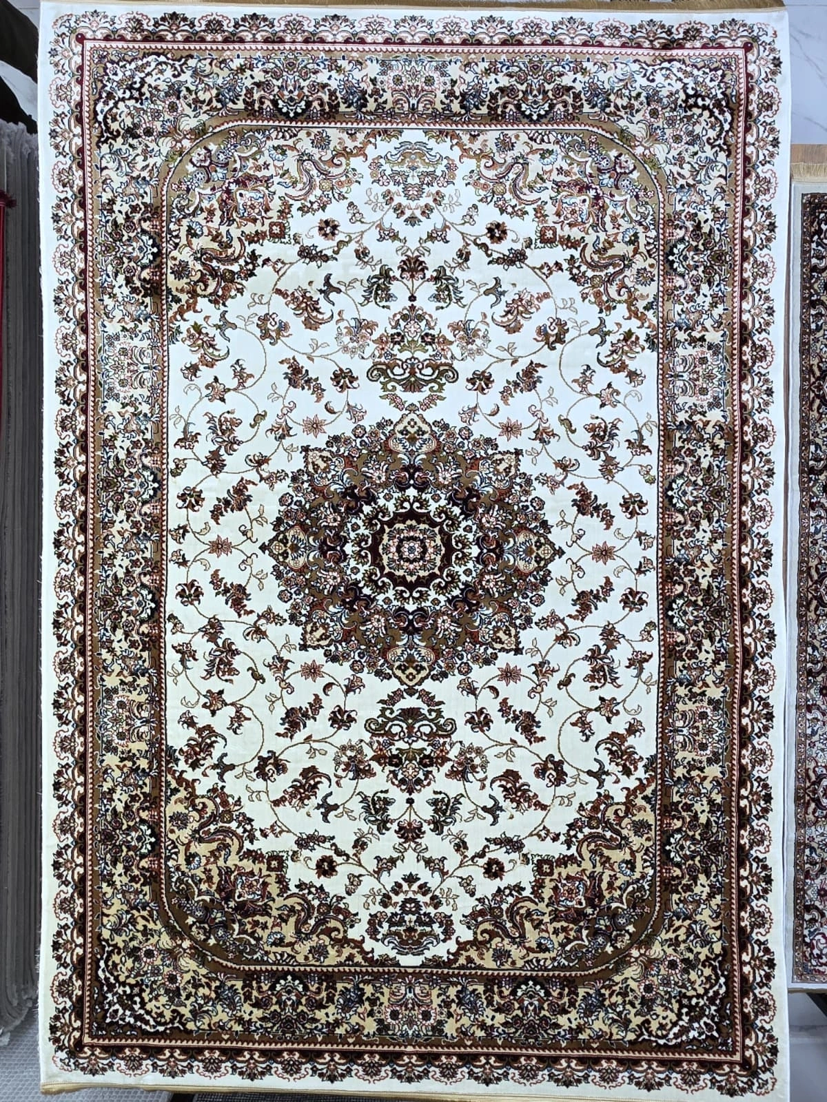 • Asar Yün İpek H3809A Krem modeli, açık krem zemini üzerinde işlenen merkezi madalyon ve simetrik köşe motifleriyle geleneksel İran halısı estetiğini modern mekânlara aktarır. Yün ve ipek karışımı yapısıyla pürüzsüz bir yüzey sunan bu halı, krem renkli halı arayanların ilk tercihi olacak. 200x290 cm boyutuyla geniş salon, oturma odası ve misafir odaları için uygundur. Klasik halı modelleri içinde hem fiyat hem kalite açısından en iyi seçenekler arasında yer almaktadır.