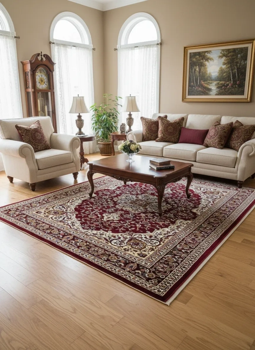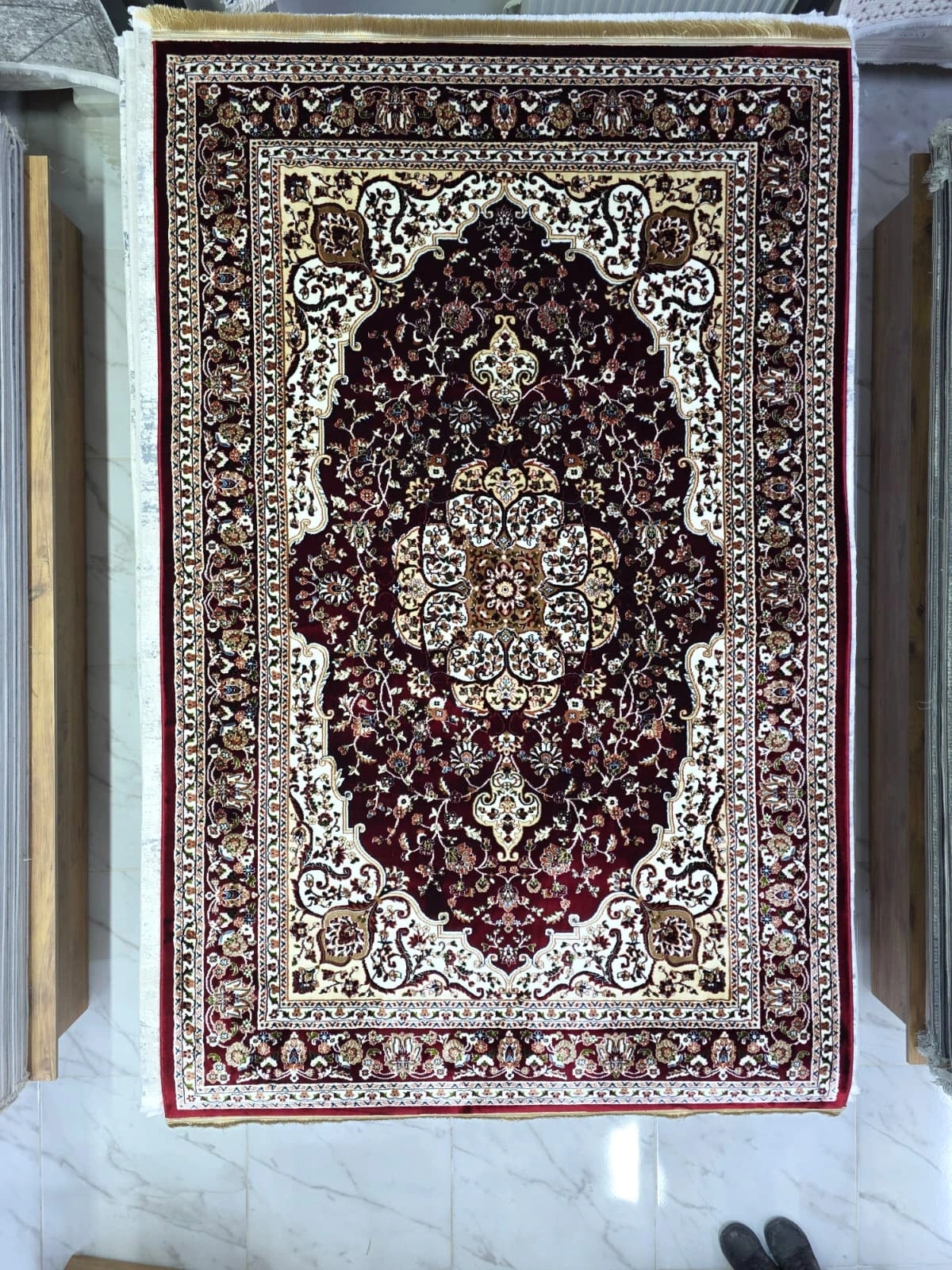 • Asar Yün İpek H3846A Koyu Kırmızı, yün ve ipek karışımı premium ipliklerle üretilen bu model, koyu kırmızı zemin üzerinde merkezi çiçekli madalyon ve krem arabesk bordür sistemiyle İran İsfahan halılarının zarifliğini modern teknolojinin hassasiyetiyle buluşturuyor. 150x233 cm boyutuyla prestijli bir salon tercihi.