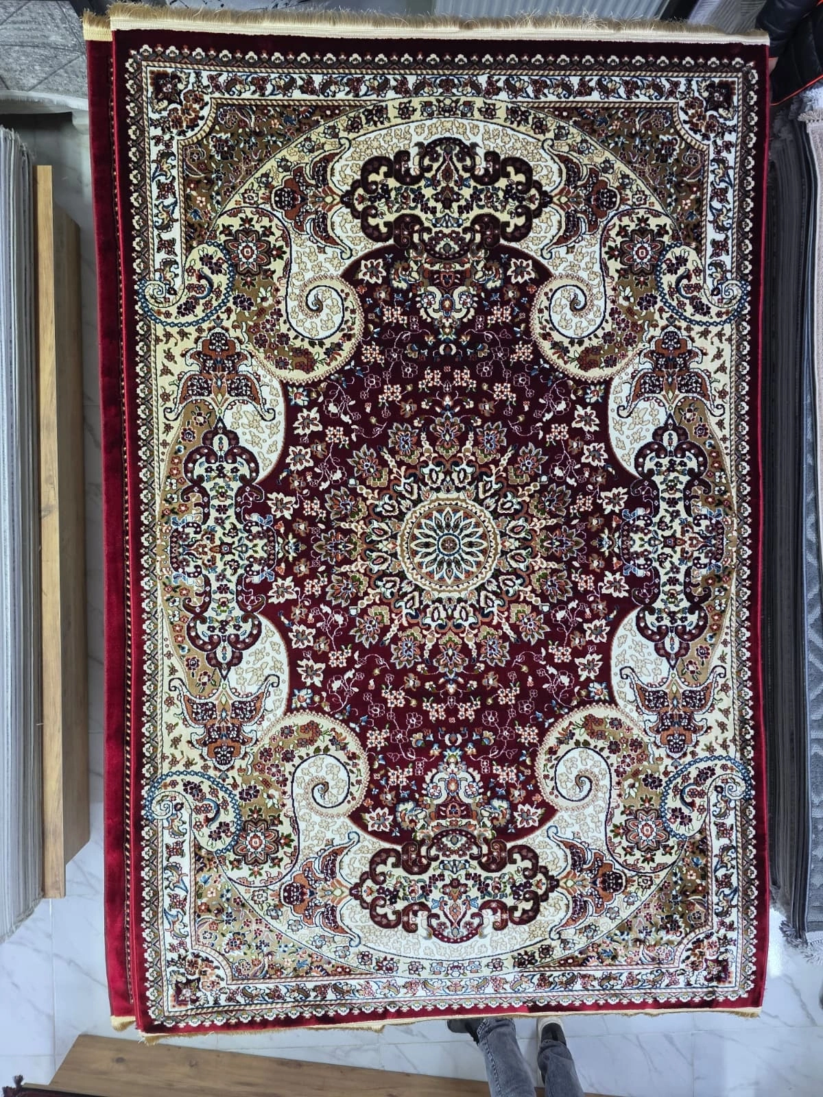 Asar Yün İpek H4030C Koyu Kırmızı Halı, köşelere yerleştirilmiş yarım ay madalyon unsurlarının merkezdeki ana madalyonla bütünleştiği görkemli kompozisyonuyla Osmanlı saray halıcılığının büyüsünü modern dönem teknolojisiyle yeniden hayata geçiriyor. Koyu kırmızı zemin üzerinde krem ve altın tonlarındaki arabesk bordür sisteminin yarattığı katmanlı zenginlik, mekânınıza saray lojmanı atmosferi katıyor. Yün ipek halı ve lüks klasik halı arayanlar için Türkiye'nin en prestijli seçeneklerinden biri olan bu model, iran halı ve hereke halı arayanların da gözdesi. Royal halı ve atlas halı seviyesinde kaliteye sahip bu ürün, en iyi halı markaları listesinin zirvesinde yer alıyor. 150x233 cm boyutuyla Türkiye genelinde uygun halı fiyatıyla kapıya teslim edilmektedir.