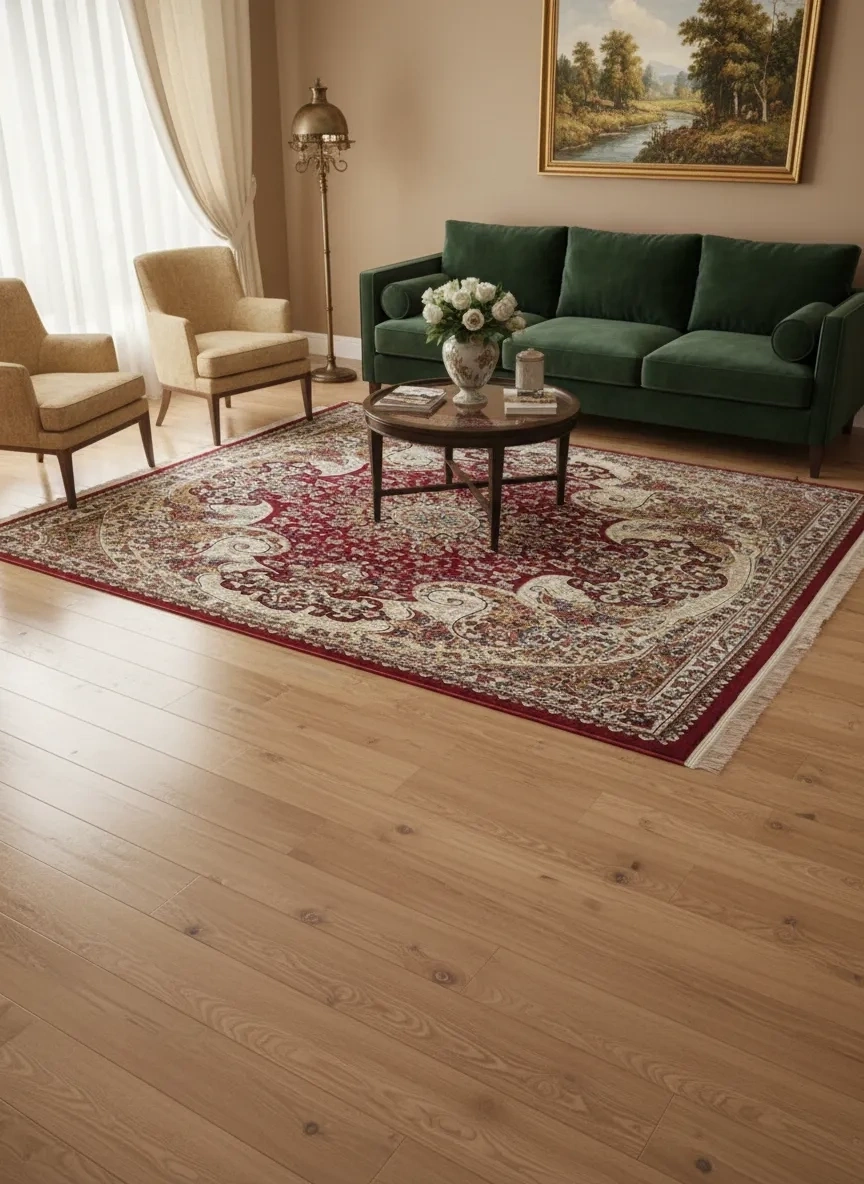 • Asar Yün İpek H4030C Koyu Kırmızı, yün ve ipek karışımı premium ipliklerle üretilen bu model, koyu kırmızı zemin üzerinde köşelere yerleştirilmiş yarım ay madalyon ve krem-altın arabesk bordür sistemiyle Osmanlı saray halılarının görkemini yansıtan prestijli bir tasarım. 150x233 cm boyutuyla büyük salonlar için eşsiz bir lüks tercih.