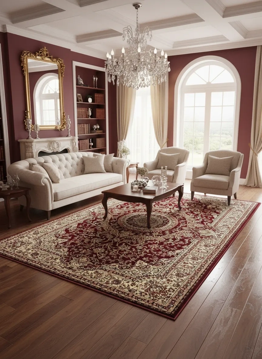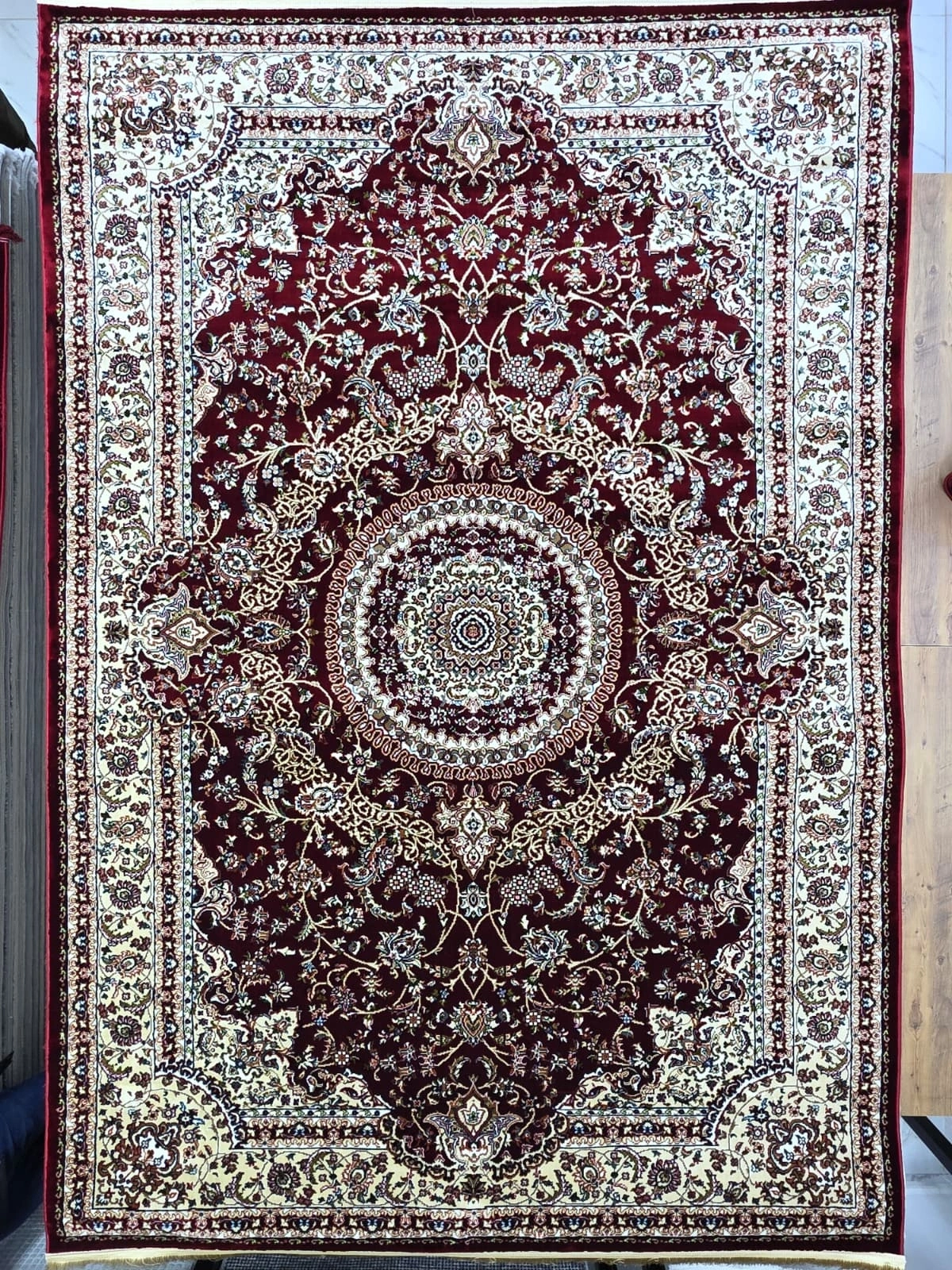 • Asar Yün İpek H4095A Koyu Kırmızı modeli, derin koyu kırmızı zemini üzerinde dairesel iç içe madalyon tasarımıyla görsel olarak güçlü bir etki yaratır. Çevreleyen yoğun bitkisel ve çiçek motifleriyle tamamlanan bu halı, kırmızı halı modelleri arayanlar için üst segment bir tercih sunar. Yün ve ipek karışımı dokusu hem pürüzsüz hem de dayanıklıdır. 200x290 cm büyük salon ve resmi oturma odaları için idealdir.