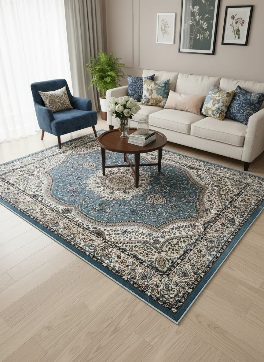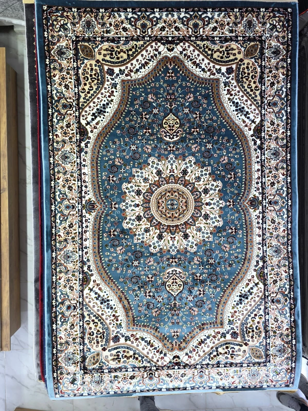 • Asar Yün İpek H4158A Mavi, yün ve ipek karışımı premium ipliklerle üretilen bu model, derin mavi-teal zemin üzerinde büyük armut biçimli madalyon ve krem çiçekli arabesk bordür sistemiyle İran klasik halılarının zarafetini mavi renk paletinde sunuyor. 150x233 cm boyutuyla salon ve oturma odaları için lüks bir tercih.