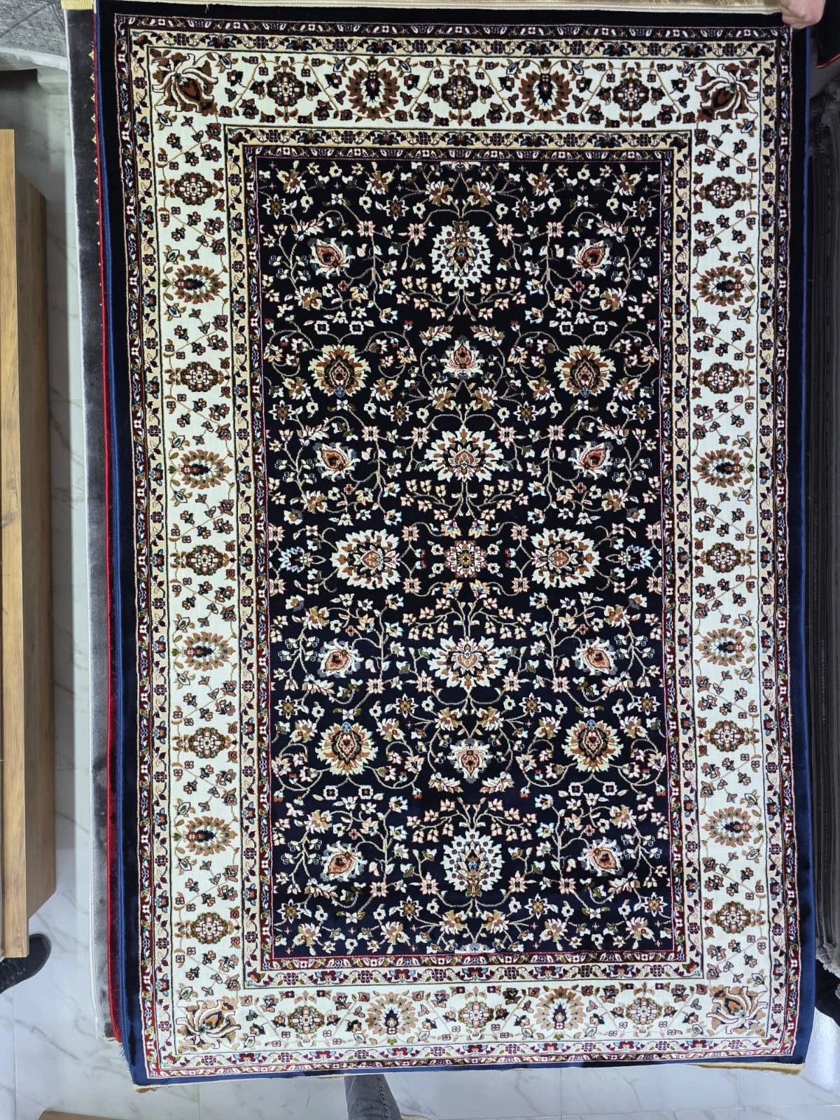 • Asar Yün İpek H5500A Lacivert, H5500A modelinin lacivert renk varyasyonunda yün ve ipek karışımı premium ipliklerle üretilen bu halı, derin lacivert zemin üzerinde krem çiçek ve dal motiflerinin tümünü kaplayan allover kompozisyonuyla İran İsfahan geleneğinin en asil versiyonunu sunuyor. 150x233 cm boyutuyla büyük salonlar için eşsiz prestij.