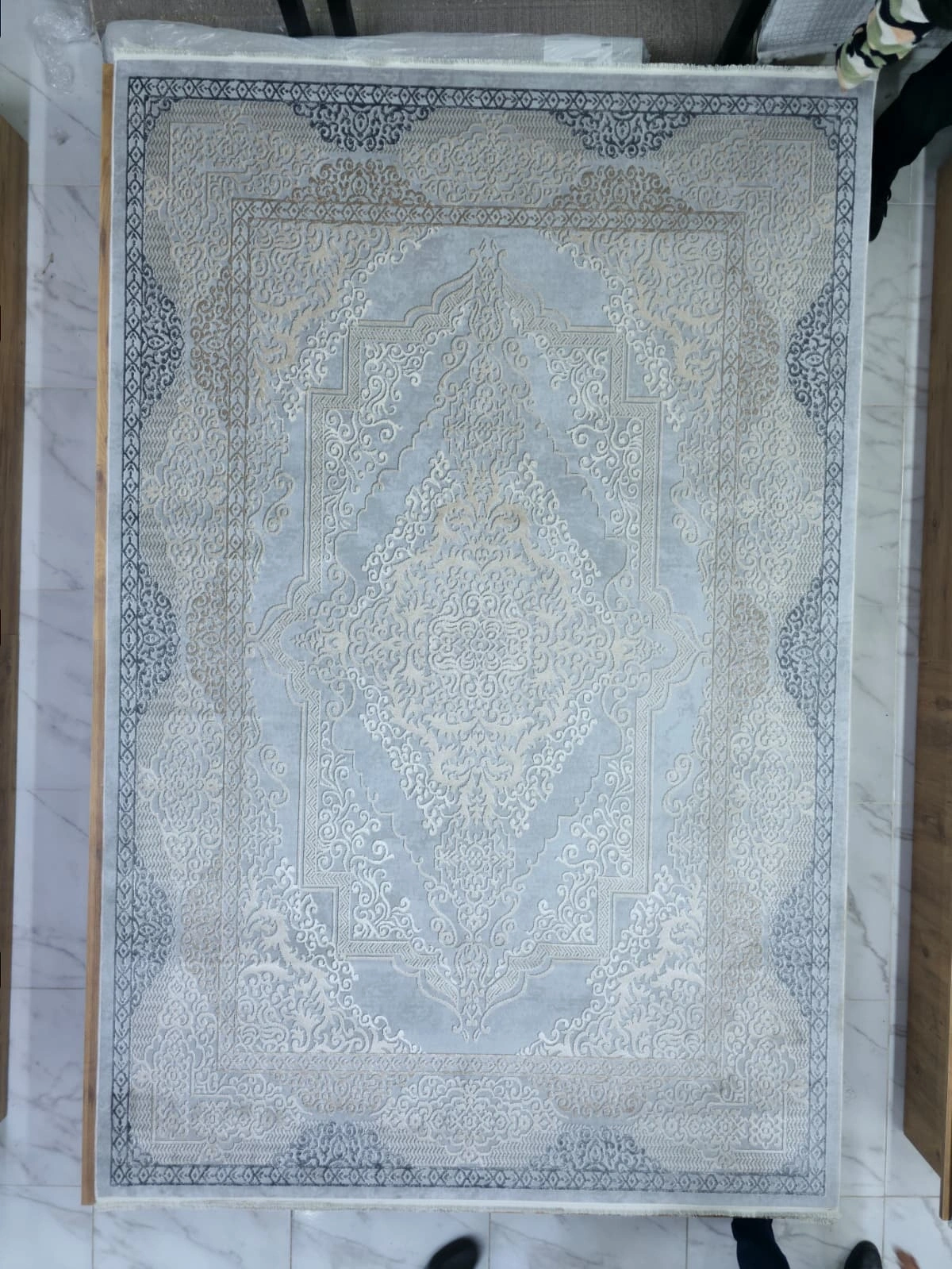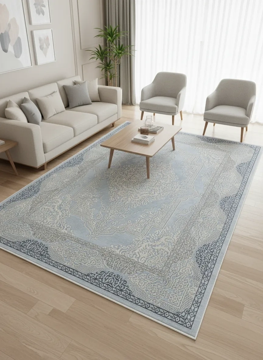 Asar Yün Moda H4864 model mavi bordürlü klasik salon halısı. Derin mavi tonu ve çerçeve bordür tasarımıyla zarif görünüm sunar. Doğal yün iplik, 200x290 cm, kaymaz taban, anti-alerjik.