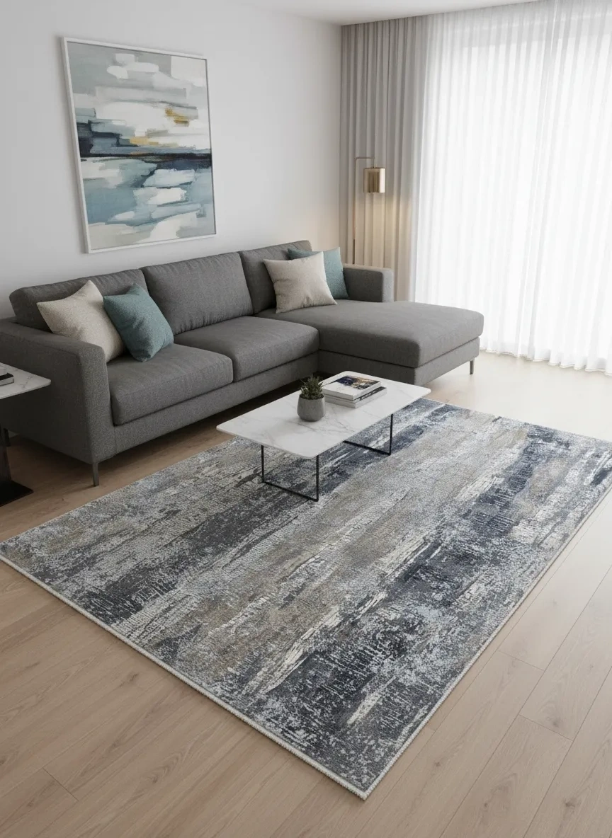 Asar Yün Moda H4872 model mavi vintage desenli salon halısı. Eskitme tekniğiyle işlenen abstrak desen, bohem ve modern dekorasyona mükemmel uyum sağlar. Yün iplik, 200x290 cm, kaymaz taban, leke tutmaz yüzey.