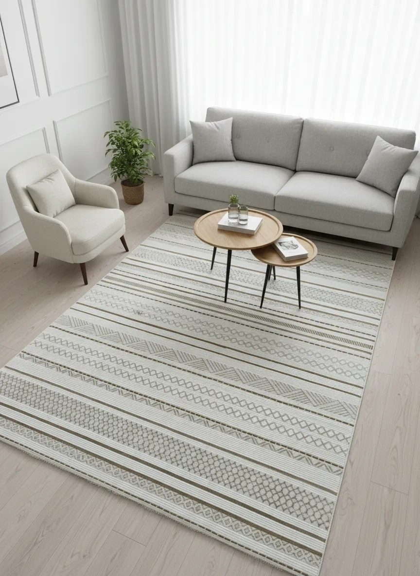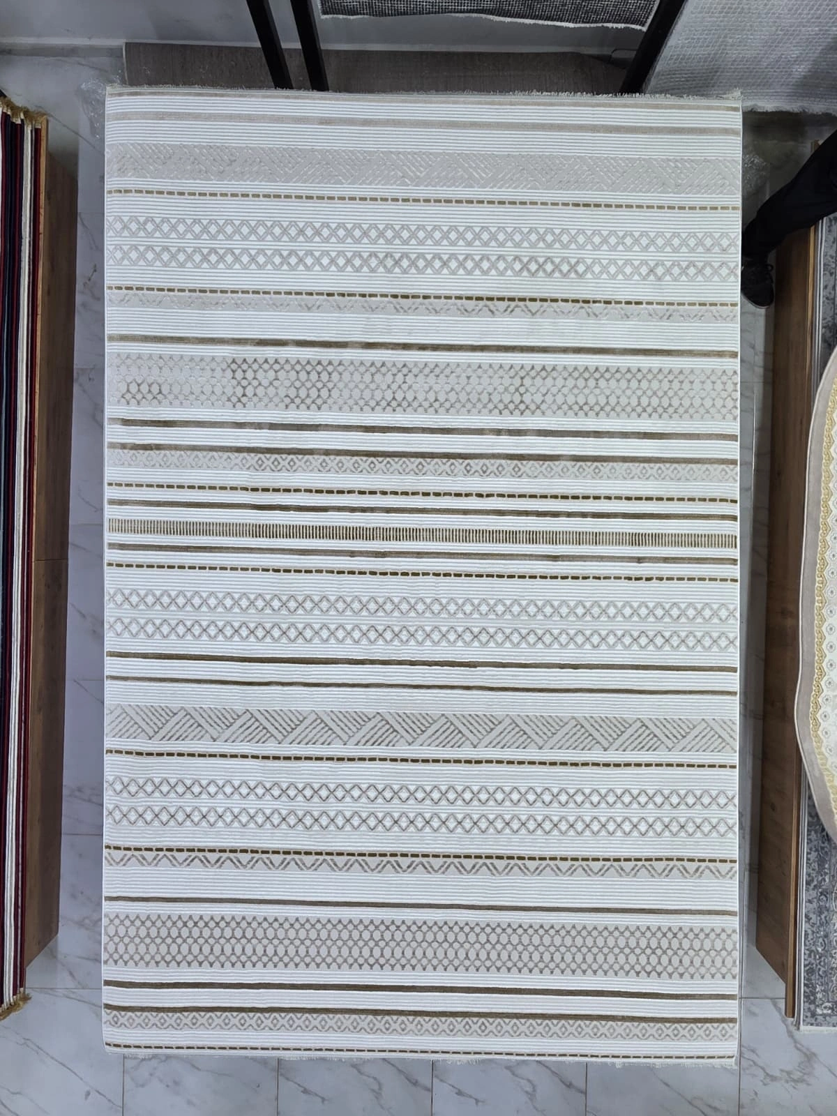 Asar Yün Moda H7031 model gold şerit çizgili bohem salon halısı. Krem beyaz zemin üzerinde altın sarısı çizgi detaylarıyla modern bohem tarzı mekânlara uyum sağlar. Yün iplik, 200x290 cm, kaymaz taban, leke tutmaz.