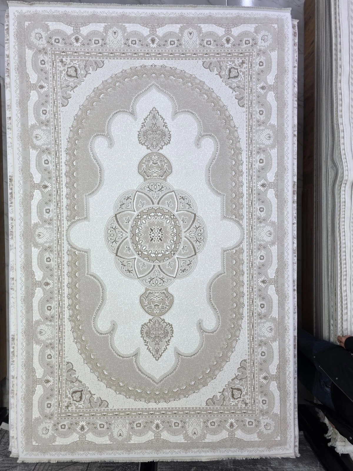 • Bu halı saçaklı yapısıyla şık bir görünüm sunar; robot süpürge dostudur, anti-alerjenik özelliği sayesinde sağlıklı bir ortam sağlar, leke tutmaz yüzeyi ile bakımı kolaydır ve makinede yıkanabilir. Asaryün imzalı bu krem renk, çiçek desenli, madalyon desenli halı 150x233 boyutunda ideal ölçüleriyle dayanıklı yapısı ve şık tasarımıyla her dekorasyon anlayışına uyum sağlar.