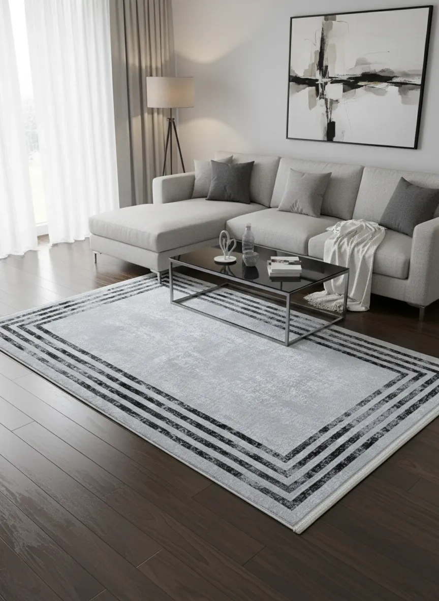 Bellino 4434 Gri Beyaz Eskitme Çerçeveli Halı, vintage ve wash halı estetiğini güçlü siyah çerçeve bordürüyle birleştirerek hem sade hem de etkileyici bir görünüm yaratıyor. Gri eskitme zemin üzerinde belirgin biçimde işlenmiş üç kademeli siyah bordür çerçevesi, mekâna tanımlı ve düzenli bir görünüm kazandırıyor. Vintage ve antika halı modelleri arayanlar için Türkiye'nin en şık seçeneklerinden biri olan bu model, wash halı görünümüyle zamanın izlerini taşıyan bir karakter sunuyor. Royal halı ve atlas halı arayanların minimalist arayışına yanıt veren bu ürün, gümüşsuyu halı ve merinos halı kalitesinde üretilmektedir. 120x180 cm boyutuyla salon, yemek odası ve oturma mekânları için ideal olan bu halı, uygun halı fiyatıyla Türkiye genelinde kapıya teslim edilmektedir.