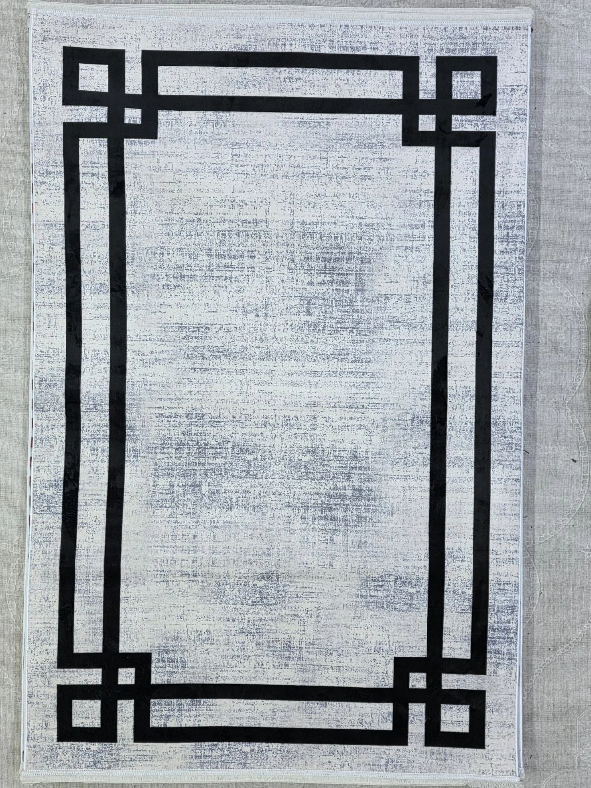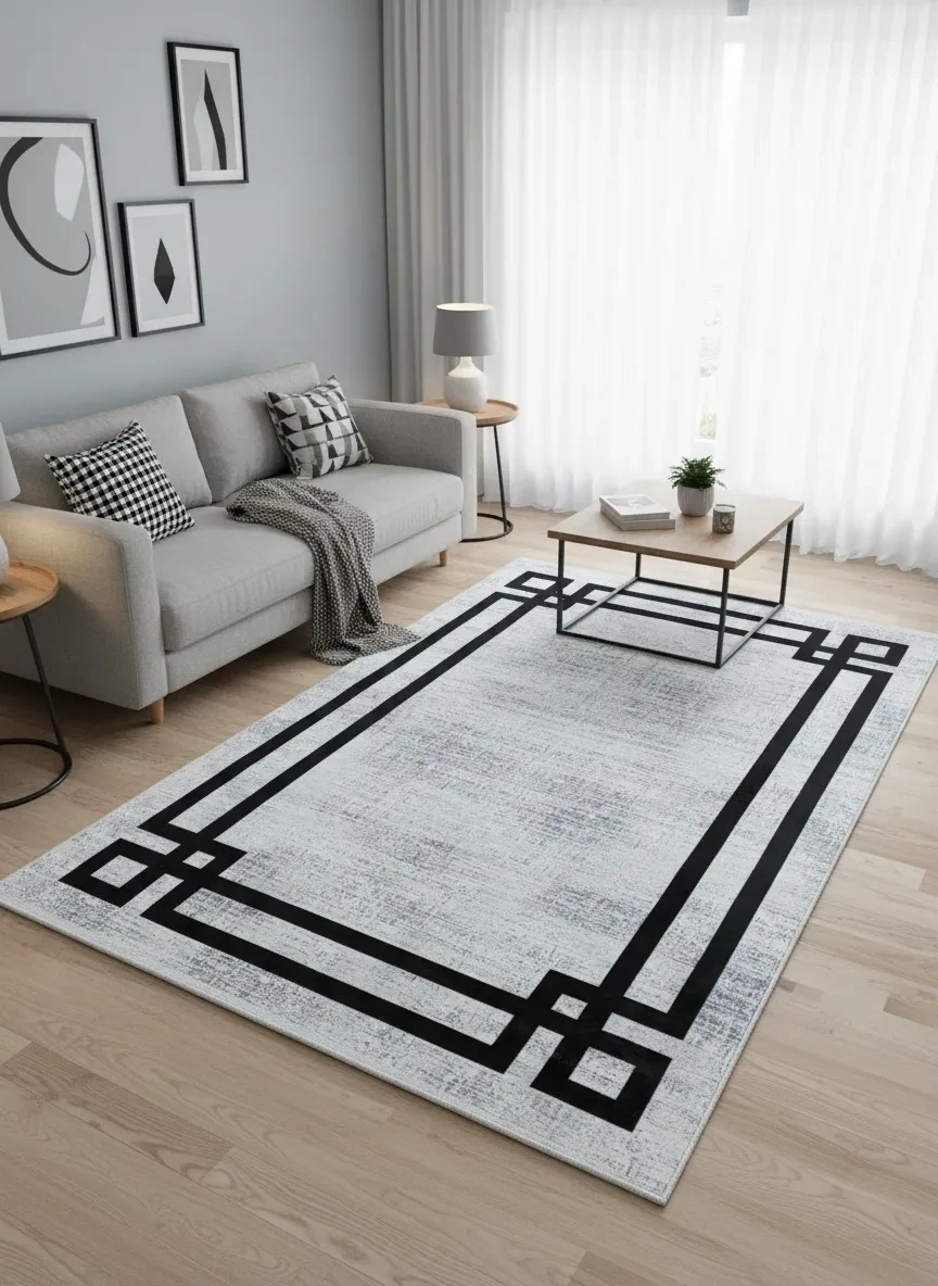 Bellino 4452 Beyaz Eskitme Köşeli Halı, Art Deco mimarisinin köşe çerçeve motifini halı tasarımına taşıyan özgün bir kompozisyon sunuyor. Beyaz eskitme zemin üzerinde dört köşeye yerleştirilen L-biçimli siyah kalın çerçeveler, mekâna güçlü bir sınır ve odak etkisi kazandırıyor. Minimalist ve modern halı modelleri arayanlar için Türkiye'nin en özgün seçeneklerinden biri olan bu model, beyaz-siyah renk anlayışıyla her tür mobilya ve dekorasyonla uyum sağlar. Royal halı ve atlas halı arayanların Art Deco arayışına yanıt veren bu ürün, gümüşsuyu halı ve merinos halı kalitesinde üretilmektedir. 120x180 cm boyutuyla salon ve oturma odaları için ideal olan bu halı, uygun halı fiyatıyla Türkiye genelinde kapıya teslim edilmektedir.