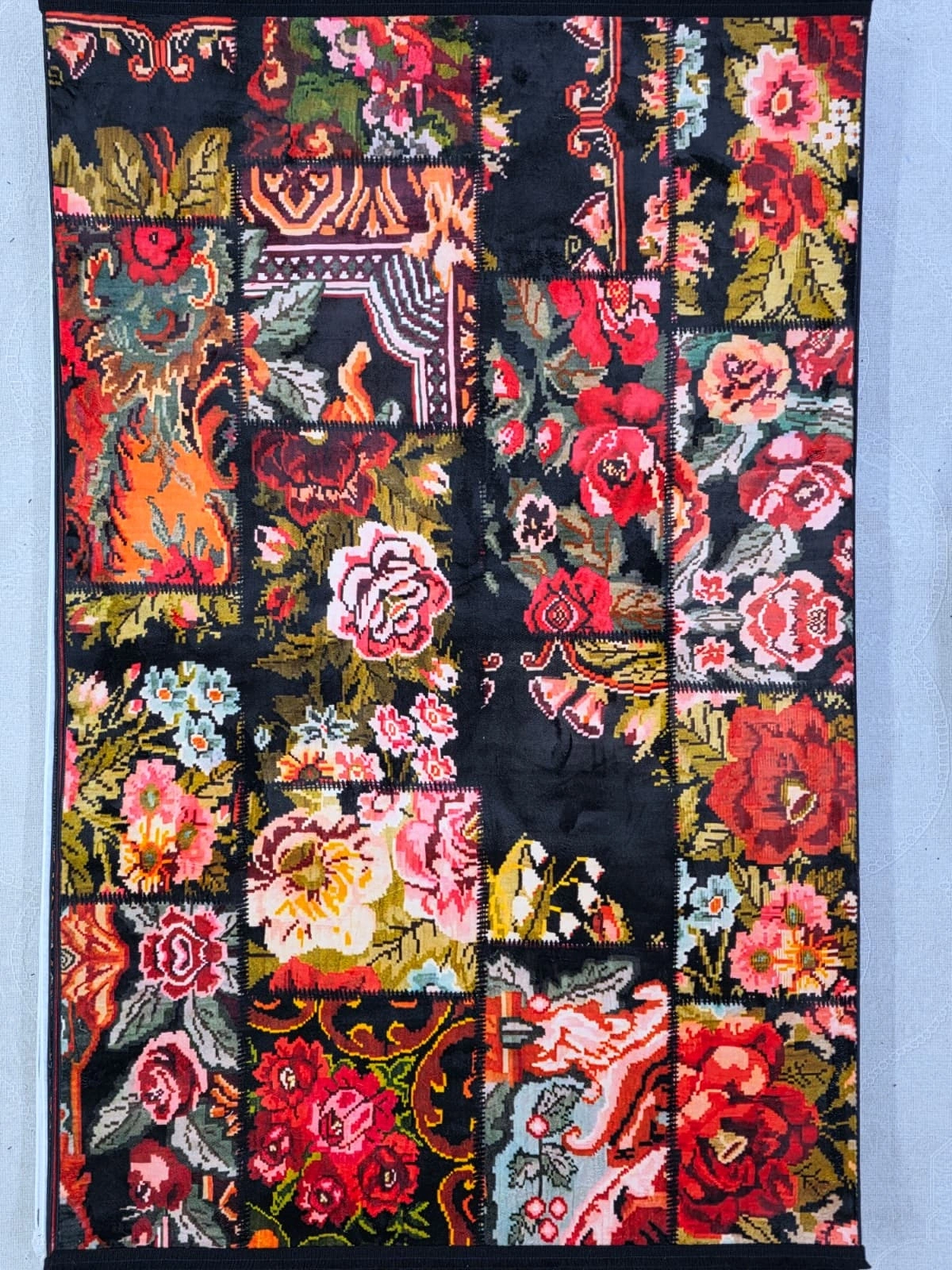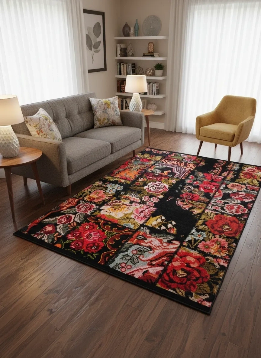 Bellino 4473 Siyah Zemin Renkli Gül Patchwork Halı 120x180