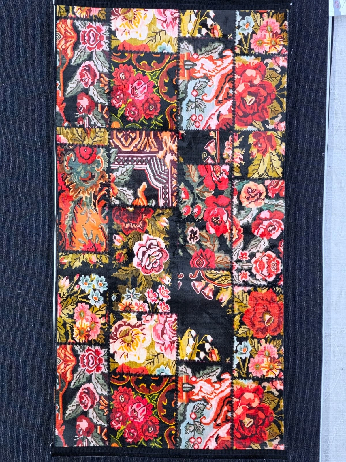 • Bellino 4673, siyah zemin üzerinde her biri farklı boyut ve türde kırmızı, pembe, turuncu ve beyaz güllerle dolu patchwork karelerden oluşan çiçek cümbüşlü halı. Zengin ve dramatik çiçek yoğunluğu mekâna bahar enerjisi katarken 80x150 cm boyutu giriş, koridor ve köşe kullanımları için mükemmel.