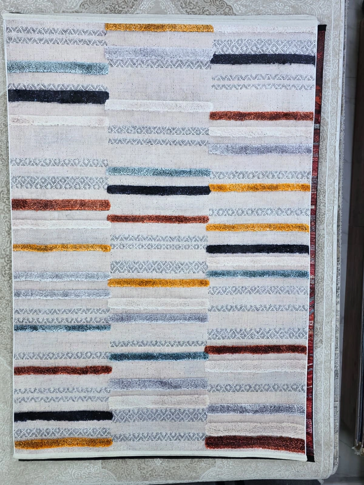 • Bellino 4903 modeli, krem zemin üzerinde gold, lacivert, gri, kiremit ve mint renklerindeki kısa çubuk çizgilerden oluşan özgün kompozisyonuyla modern ve bohem dekorasyonların gözdesi. Sanki bir sanatçının fırça darbeleriyle bezediği bu halı, 160x230 cm boyutuyla salonunuza canlı ve sanatsal bir karakter katıyor.