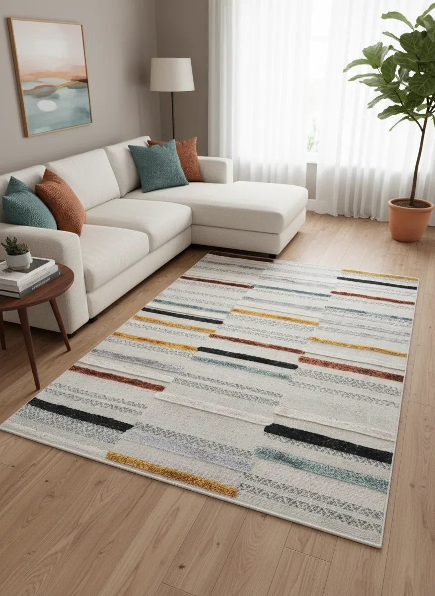 Bellino 4903 Krem Renkli Çizgili Halı, geleneksel halı kalıplarını tamamen kırarak serbest fırça darbeleri etkisi yaratan çizgisel deseniyle benzersiz bir modern sanat eseri gibi duruyor. Krem zemin üzerinde gold, lacivert, gri, kiremit, mint ve siyah tonlarındaki kısa çubuk çizgiler, mekânınıza sanatsal ve dinamik bir enerji katmaktadır. Modern halı modelleri ve bohem dekorasyonu sevenler için vazgeçilmez olan bu tasarım, aynı zamanda sakin krem zemini sayesinde diğer mobilyalarla kolayca uyum sağlar. Atlas halı ve royal halı severlerin yeni trende ayak uydururken kaliteden ödün vermemesini sağlayan bu model, gümüşsuyu halı ve merinos halı alternatifi arayanlar için mükemmel bir tercih. 160x230 cm boyutuyla salon, oturma ve çalışma odaları için uygun olan bu ürün, Türkiye genelinde uygun halı fiyatıyla kapıya teslim edilmektedir.