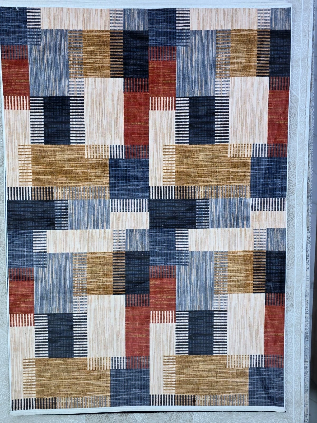 • Bellino 4936 modeli, lacivert, kırmızı, gold ve krem tonlarındaki büyük blok ve dikdörtgen formların oluşturduğu cesur patchwork kompozisyonuyla mekânınıza güçlü bir renk ve desen enerjisi katar. Modern sanat tablolarını andıran bu tasarım, 160x230 cm boyutuyla geniş salonlar için etkileyici bir zemin örtüsü sunar.