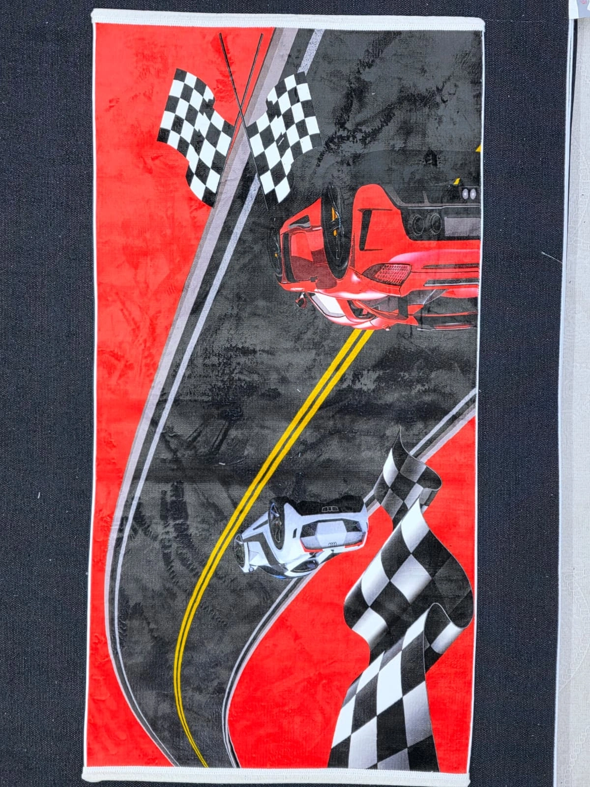 • Bellino 5446, kırmızı ve siyah dramatik zemin üzerinde yarış bayrakları, spor arabalar ve pistlerin oluşturduğu hızlı ve dinamik formula yarış kompozisyonuyla erkek çocuk ve gençlerin odalarına yarış pistinin heyecanını taşıyan cesur bir halı. 80x150 cm boyutuyla çocuk ve genç odaları için ideal.
