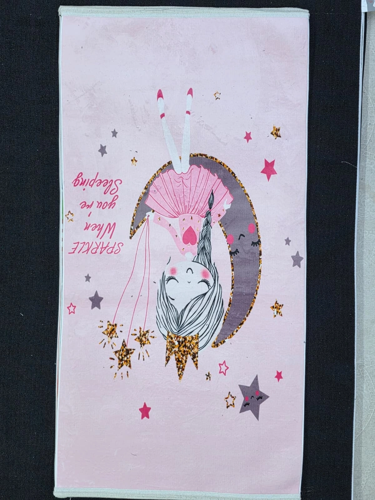 Bellino 5473 Unicorn Pembe Kız Çocuk Halısı, her kız çocuğunun hayalindeki masal dünyasını odanın zeminine taşıyan büyülü bir tasarım. Pastel pembe zemin üzerinde ay dilimi üzerinde oturan sevimli unicorn figürü, altın yıldız aksesuarlar, renkli yıldız serpintileri ve 'Sparkle When You're Sleeping' yazısıyla döşenmiş bu halı, bir çocuk odasını peri masalına dönüştürüyor. Kız çocuk odası halısı ve bebek odası halısı arayanlar için Türkiye'nin en sevimli ve hediye değeri en yüksek seçeneklerinden biri olan bu model, prenses ve unicorn temalı dekorasyonlara mükemmel uyum sağlar. Kaymaz tabanı ve leke tutmaz yüzeyiyle hem güvenli hem pratik olan bu halı, 80x150 cm boyutuyla uygun fiyata Türkiye genelinde kapıya teslim edilmektedir.