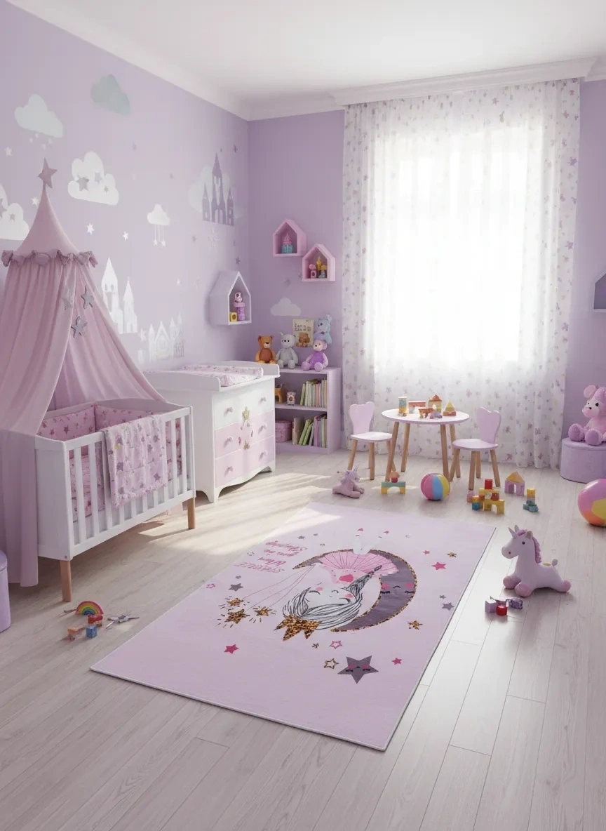 • Bellino 5473, pastel pembe zemin üzerinde ay üzerinde oturan sevimli unicorn figürü, altın yıldızlar ve renkli yıldız serpintileriyle kız çocuklarının masal dünyasını odalarına taşıyan büyülü bir halı. 80x150 cm boyutuyla bebek odası ve kız çocuk odaları için en romantik zemin seçimi.