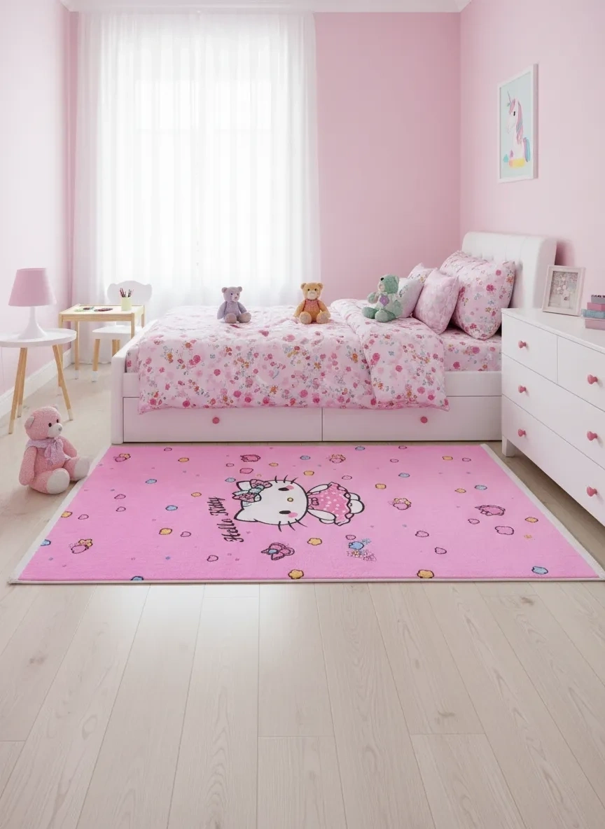 Bellino 5480 Pembe Sevimli Kedi Halısı, canlı pembe zemini üzerinde sevimli kedi karakteri, renkli kalpler, çiçekler ve kelebek motifleriyle kız çocuklarının gözlerini parlatacak renk cümbüşlü bir oyun dünyası yaratıyor. Kız çocuk odası halısı ve bebek odası halısı arayanlar için Türkiye'nin en neşeli ve hediye değeri en yüksek seçeneklerinden biri olan bu model, pembe sevdası olan küçük hanımların vazgeçilmezi haline geliyor. Kolay temizlenebilir ve leke tutmaz yüzeyiyle her türlü kullanıma dayanıklı olan bu halı, kaymaz tabanıyla güvenli bir oyun alanı oluşturuyor. 80x150 cm boyutu ve uygun fiyatıyla Türkiye genelinde kapıya teslim edilmektedir.