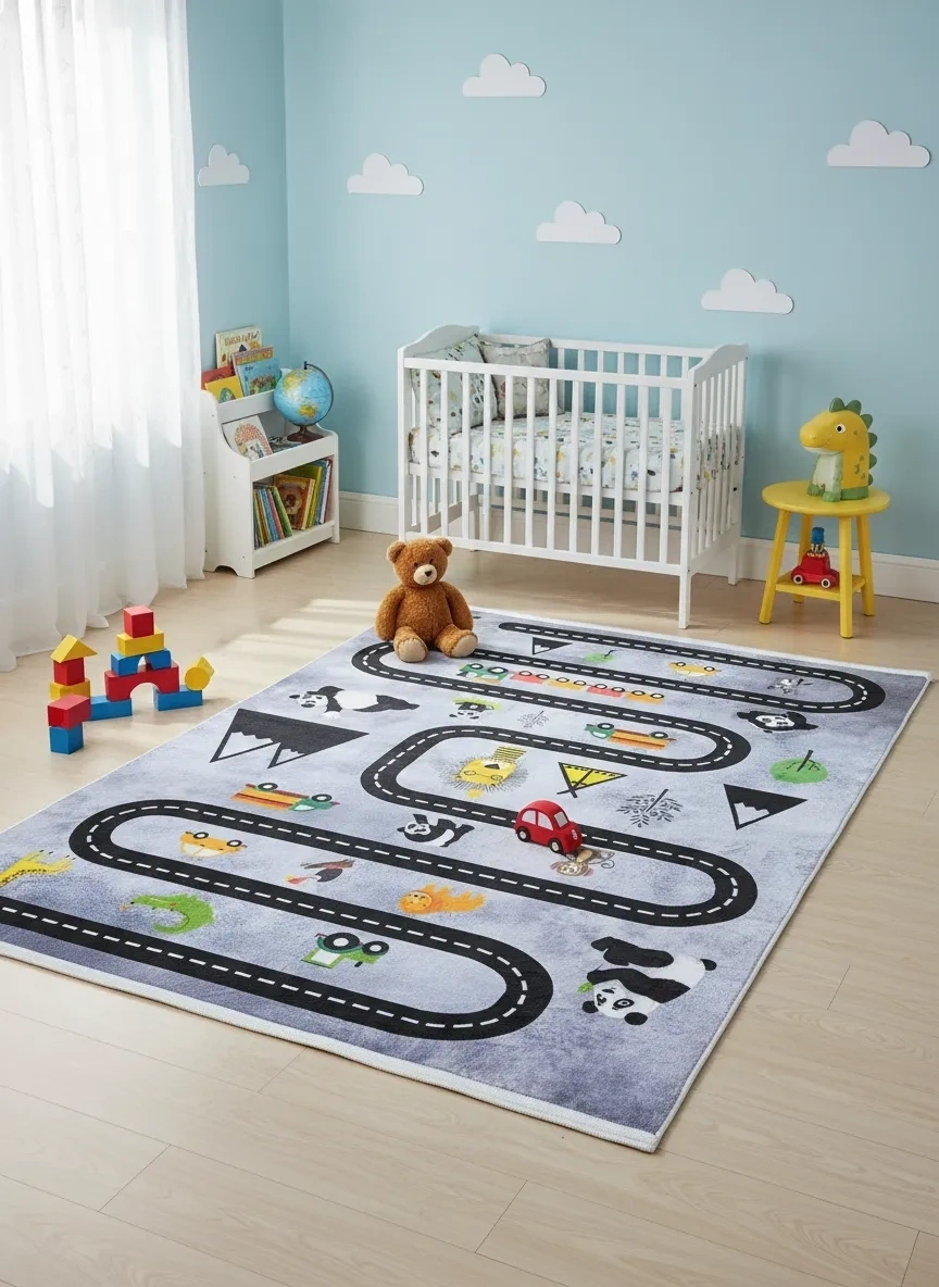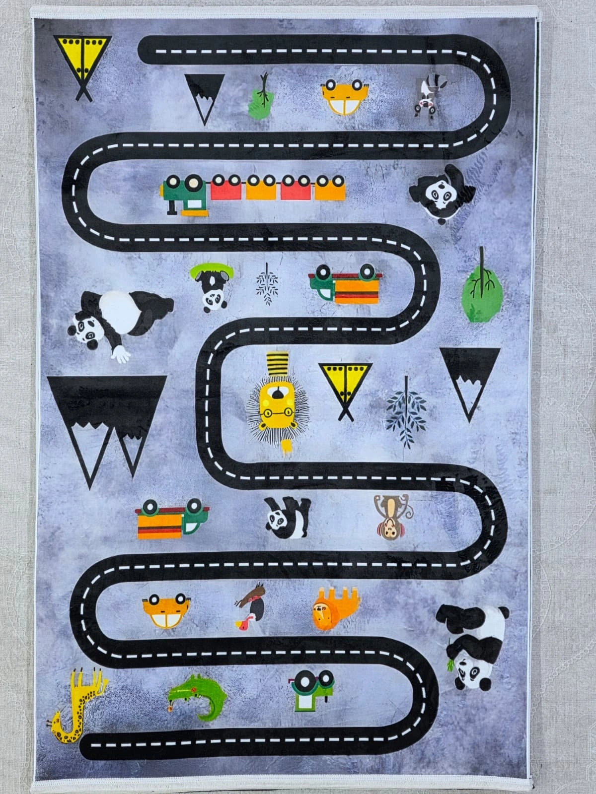 • Bellino 5489, gri zemin üzerinde kıvrımlı trafik yolunun kenarlarına yerleştirilmiş panda, zürafa, aslan, kaplumbağa ve diğer sevimli hayvan figürleriyle çocukları maceraya davet eden renkli bir oyun halısı. 120x180 cm boyutuyla çocuk odası, bebek odası ve oyun köşeleri için ideal.