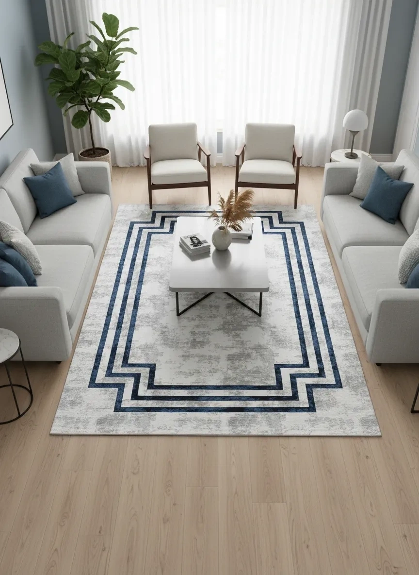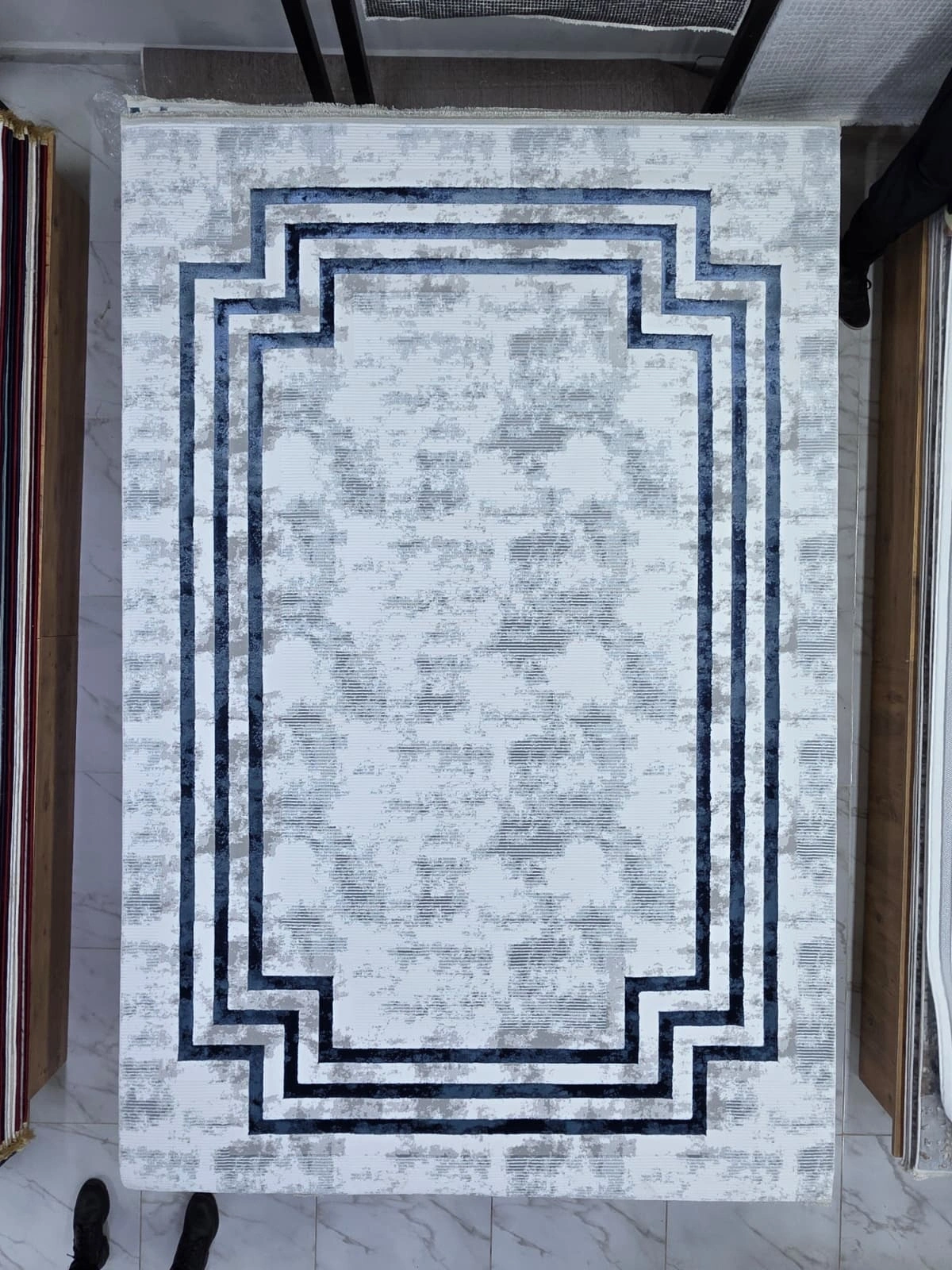 Çapan Armoni H5598B model lacivert beyaz bordürlü salon halısı. Lacivert geometrik bordür çerçevesi ve beyaz zemin kombinasyonuyla modern salonlara ideal seçimdir. PES flosh dokuma, 200x290 cm, kaymaz taban, uzun ömürlü.