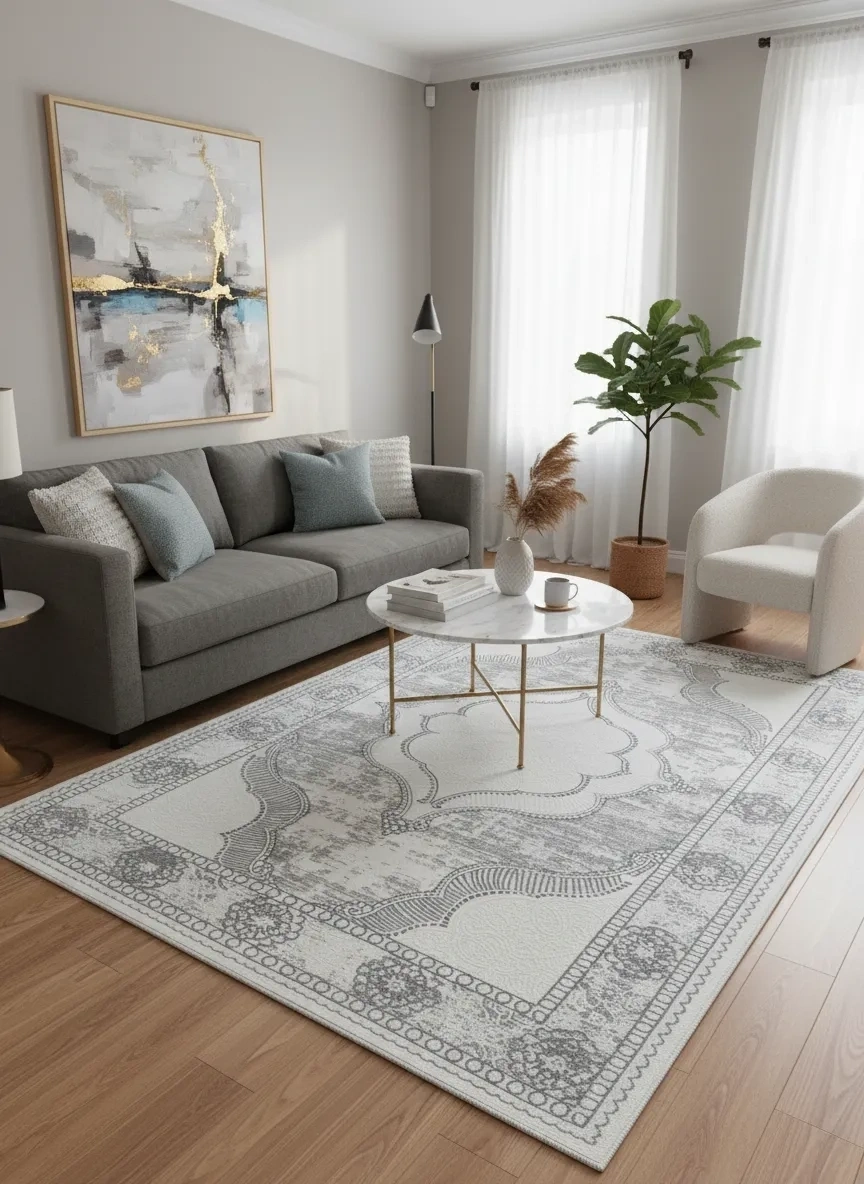 Çapan Armoni H6294A Beyaz Gri Lacivert Madalyon Salon Halısı 160x230 — Flosh Eskitme