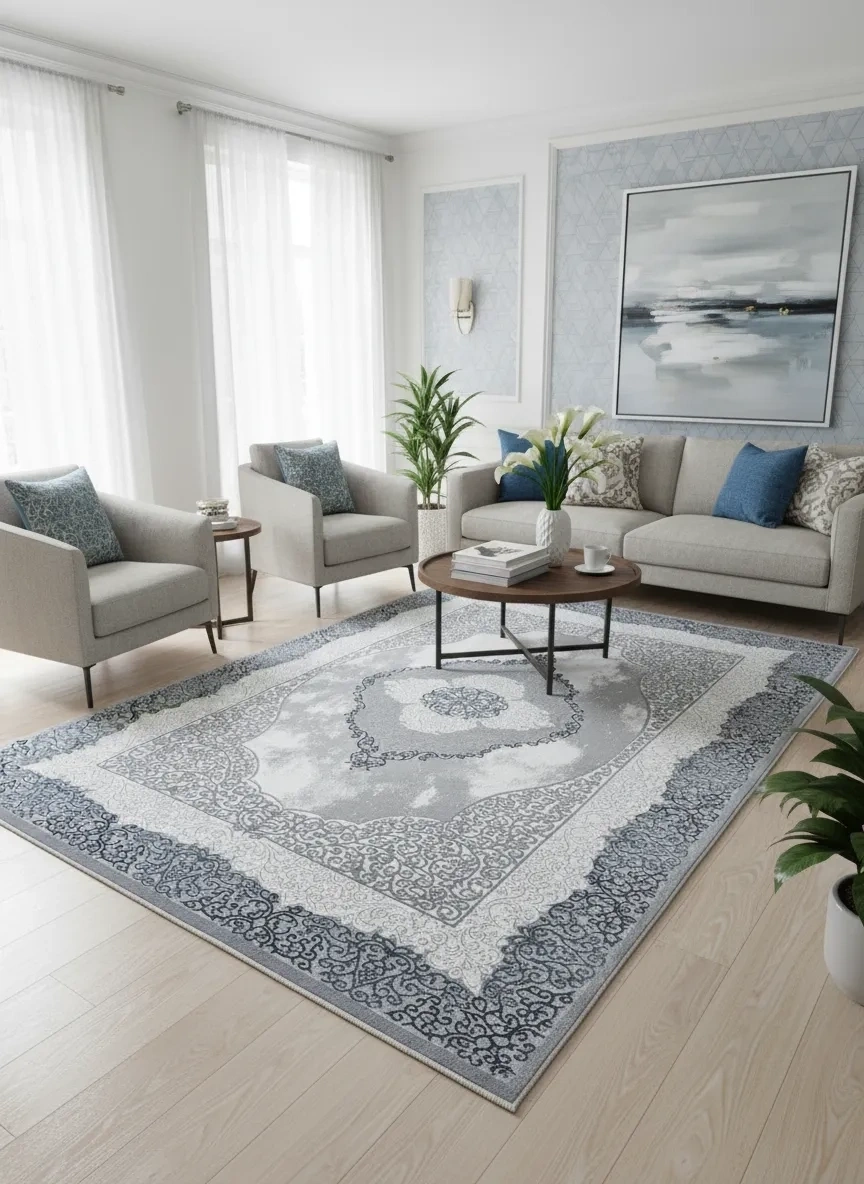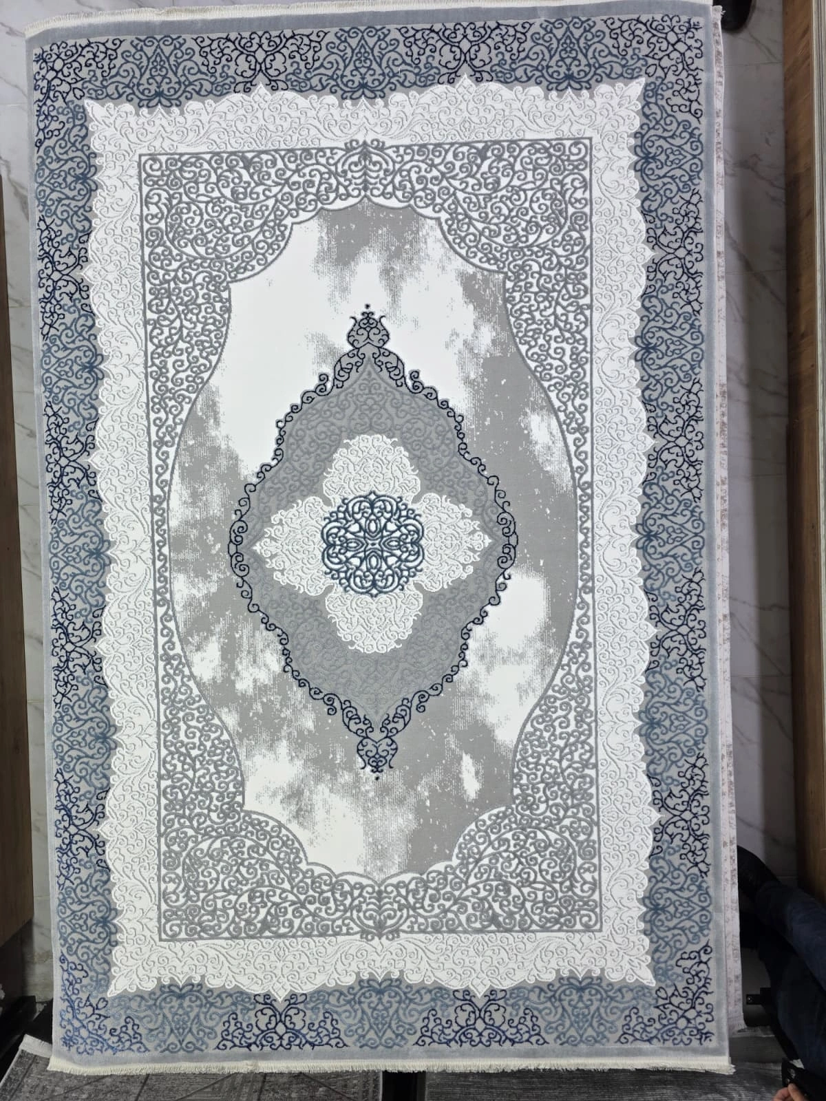 Çapan Armoni H6296A Beyaz Gri Mavi Klasik Madalyon Salon Halısı 160x230 — Osmanlı Saçaklı