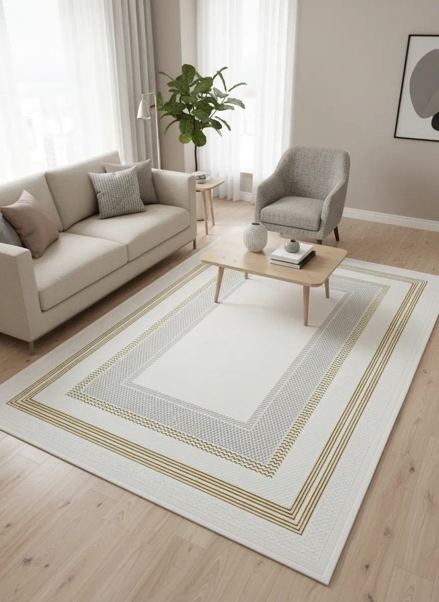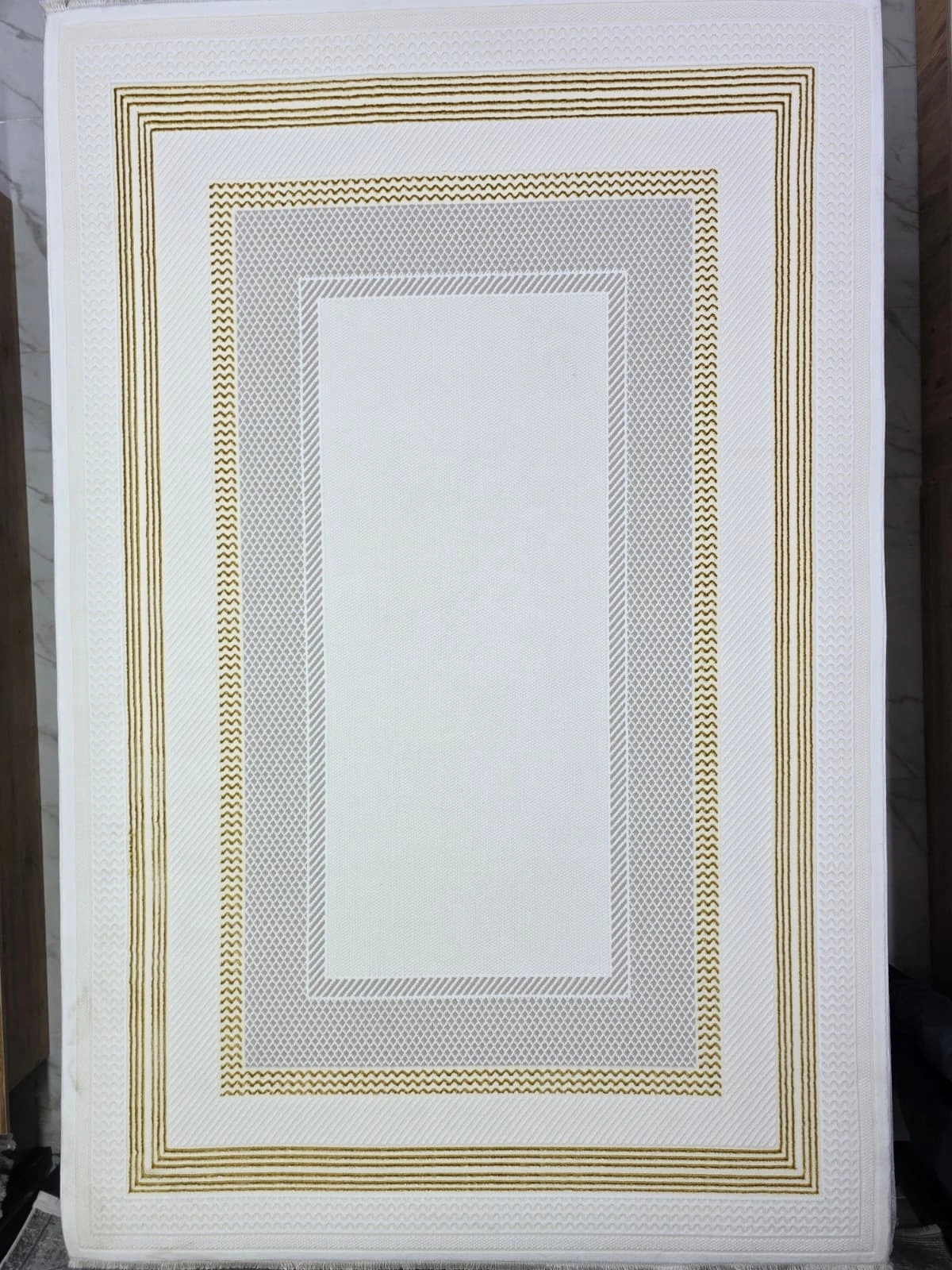 Çapan Armoni H6812A Beyaz Gold Çerçeveli Lüks Salon Halısı 160x230 — Altın Bordür Flosh