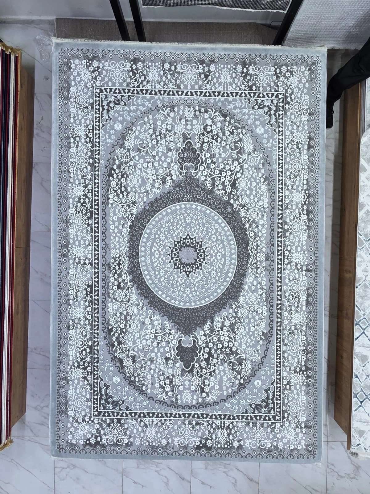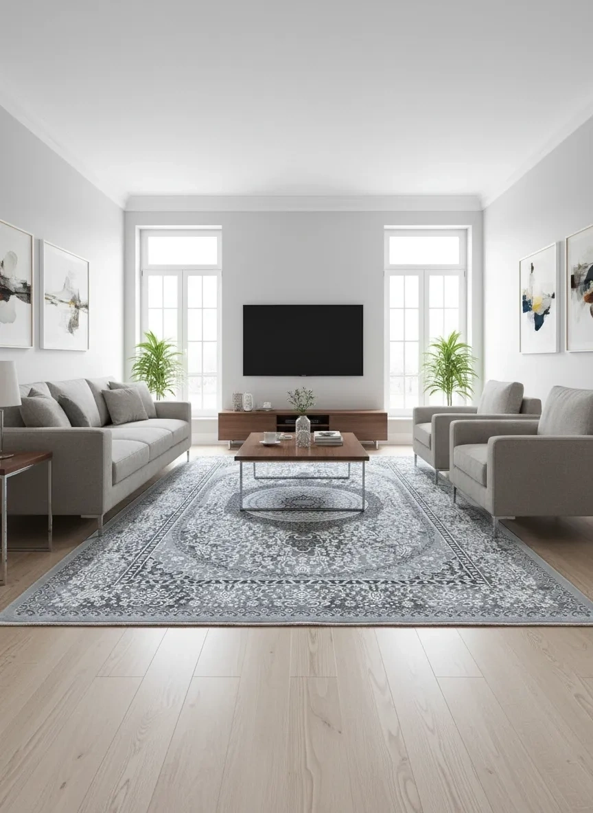 Çapan Armoni H7280A model gri madalyonlu klasik salon halısı. Merkezi madalyon motifi ve yoğun çiçek desenleriyle klasik Doğu halı geleneğini yaşatır. PES flosh dokuma, 200x290 cm, kaymaz taban, uzun ömürlü yapı.
