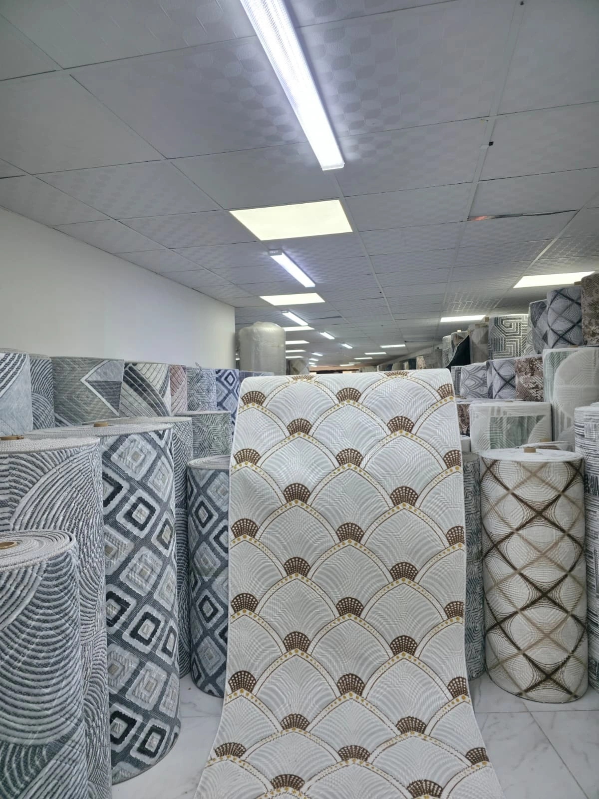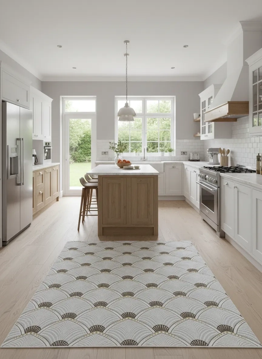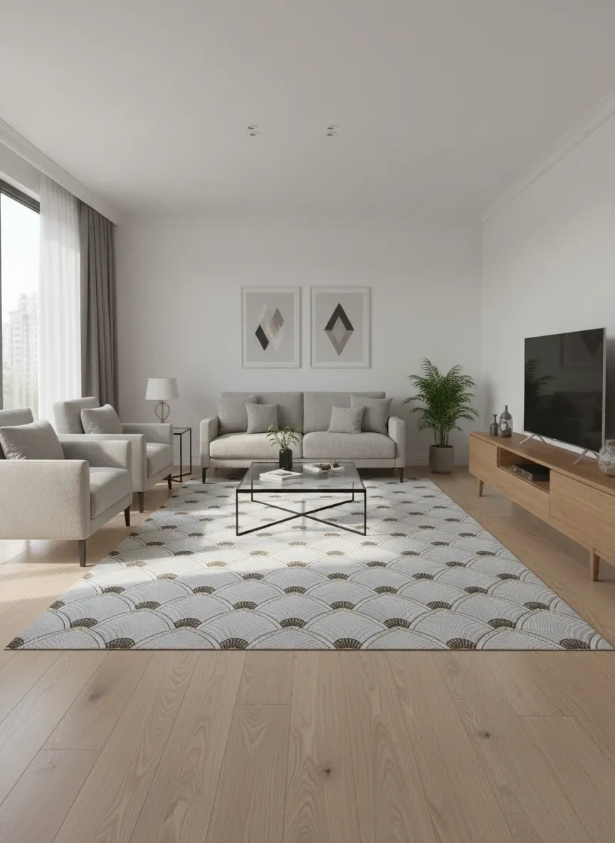 Dinarsu D004 Beyaz-Gold Halı, Art Deco döneminin sembolik balık pulu (fan/yelpaze) motiflerini beyaz zemin üzerinde altın ve bej tonlarında yeniden yorumlayan prestijli bir tasarım sunar. Her yelpaze motifi içindeki ince nokta detayları, halıya üç boyutlu bir derinlik ve el işçiliğini andıran bir incelik kazandırır; oturma odası, yemek odası, misafir alanı ve antre gibi temsil mekânlarına ihtişam katar. Art Deco estetiği, hem klasik lüks hem de çağdaş sofistike mekânlarda zemin tasarımının en güçlü ifadelerinden biri olmaya devam etmektedir. Bu halı, altın detayları ve beyaz zeminiyle özellikle aynı tonlardaki mobilyalar, kristal avizeler ve kadife aksesuarlarla birlikte kullanıldığında olağanüstü bir uyum yaratır. Dinarsu'nun üstün makine dokuması kalitesiyle, bu lüks tasarım uzun yıllar boyunca görkemini korur.
