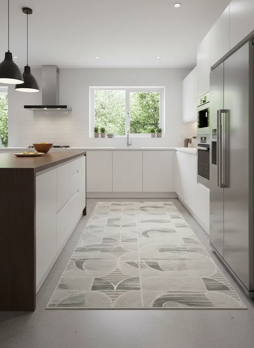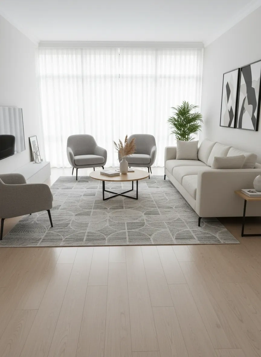 Dinarsu D005 Beyaz-Yeşil Halı, beyaz zemin üzerinde adaçayı ve sage yeşili tonlarında geometrik yıldız ve daire formlarının büyük ölçekli kompozisyonuyla mekânlara doğal bir ferahlık ve çağdaş bir karakter katar. Büyük ölçekli motifler, özellikle geniş oturma odaları ve açık plan yaşam alanlarında zemin tasarımının hakimiyetini güçlü biçimde kurar. Yeşil, 2024-2025 döneminin en güçlü trend rengi olarak iç mekân tasarımında öne çıkmaya devam etmektedir. Bu halı, o trendi modern geometrik bir dille yaşam alanlarınıza taşır. Beyaz, krem, bej, ahşap tonu ve doğal renkli mobilyalarla kusursuz uyum sağlar; bitkilerle ve doğal malzemelerle zenginleştirilmiş mekânlarda muhteşem bir bütünlük oluşturur. Dinarsu'nun dayanıklı makine dokuması, bu ferah tasarımı uzun yıllar canlılığıyla korur.
