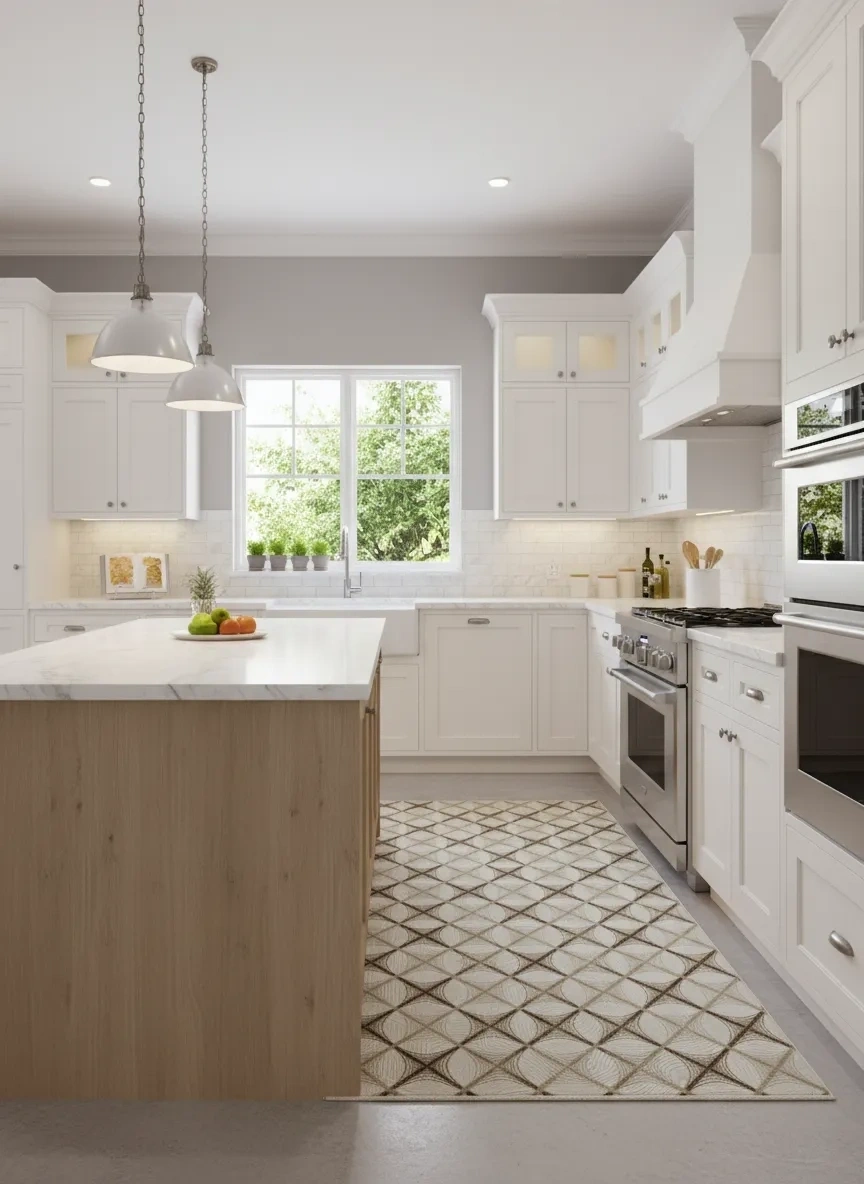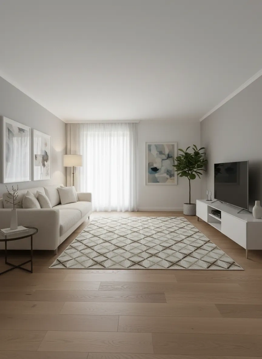 Dinarsu D009 Beyaz-Kahve Halı, beyaz zemin üzerinde kahverengi tonlarda büyük baklava ve ağ formlarının birbirine geçtiği güçlü bir geometrik kompozisyon sunar. Birbiriyle kesişen çizgiler, mekânda görsel bir kafes etkisi yaratarak derinlik ve dinamizm kazandırır; oturma odası, yemek odası, antre, koridor ve çalışma odası gibi evin her alanında baskın ve güçlü bir zemin ifadesi oluşturur. Beyaz ve kahverengi renk ikilisi, saflık ile sıcaklığı bir araya getiren evrensel bir uyum sunar. Özellikle beyaz dominant mekânlarda sıcaklık katmak için mükemmel bir zemin tercihi olan bu halı; bej, krem, kahve ve ahşap tonlu mobilyalarla da kusursuz uyum sağlar. Dinarsu'nun sağlam makine dokuması ile bu karakterli tasarım, uzun yıllar dayanıklı ve şık bir kullanım sunar.