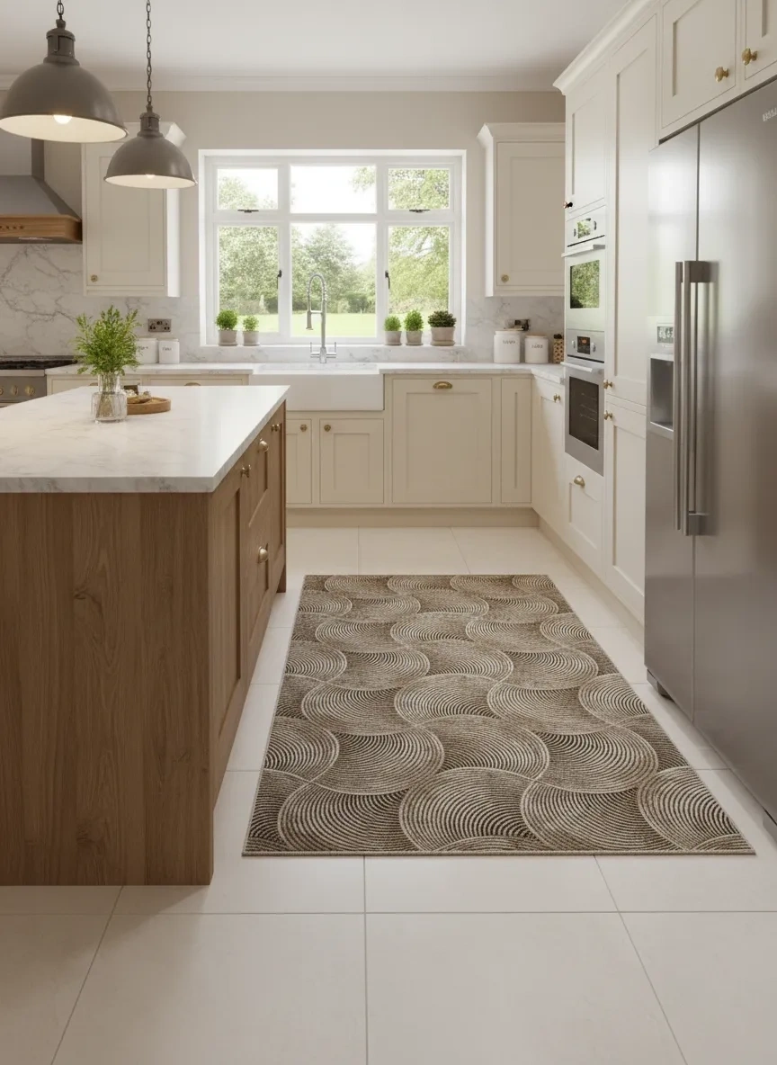 Dinarsu D010 Bej Spiral Halı, iç içe geçen spiral ve daire formlarının bej ve kahve tonlarında oluşturduğu organik ve akışkan bir kompozisyon sunar. Her dairenin kendi içinde dönen spiral çizgiler, halıya hipnotik bir derinlik ve hareket hissi kazandırır; oturma odası, yemek odası, antre, koridor ve yatak odası gibi evin her köşesinde büyüleyici bir zemin deneyimi yaratır. Spiral ve daire formları, doğanın kıvrımlı çizgilerinden ilham alarak mekânlara organik bir yumuşaklık ve akışkanlık hissi verir. Bu özelliği, sert köşeli geometrik halıların aksine mekânı hem hareketlendiren hem de sakinleştiren özel bir denge kurar. Bej, krem, kahve ve doğal tonlu dekorasyonlarla mükemmel uyum içinde çalışır. Dinarsu'nun kaliteli makine dokuması ile bu büyüleyici tasarım uzun yıllar boyunca özgünlüğünü ve canlılığını korur.