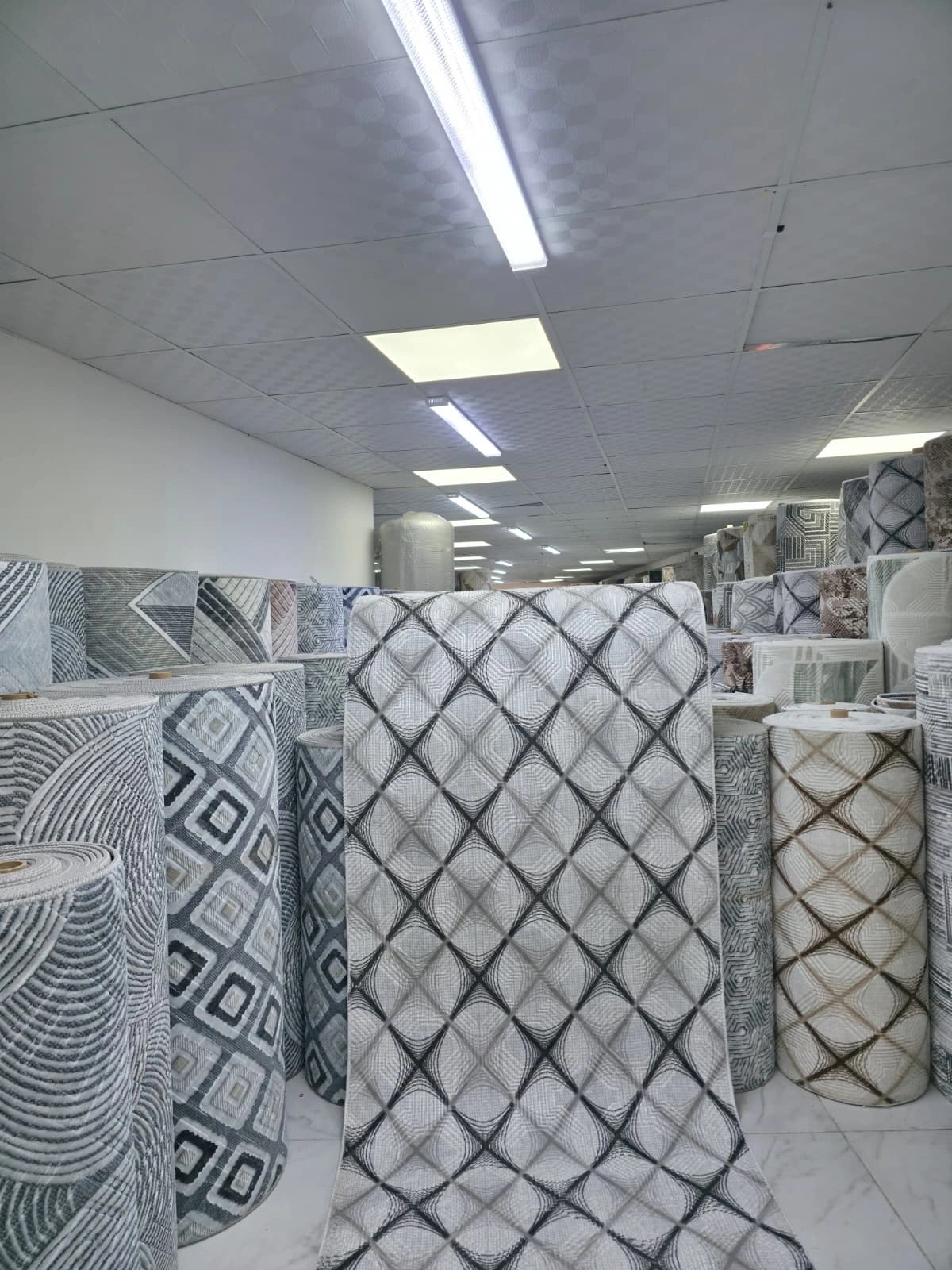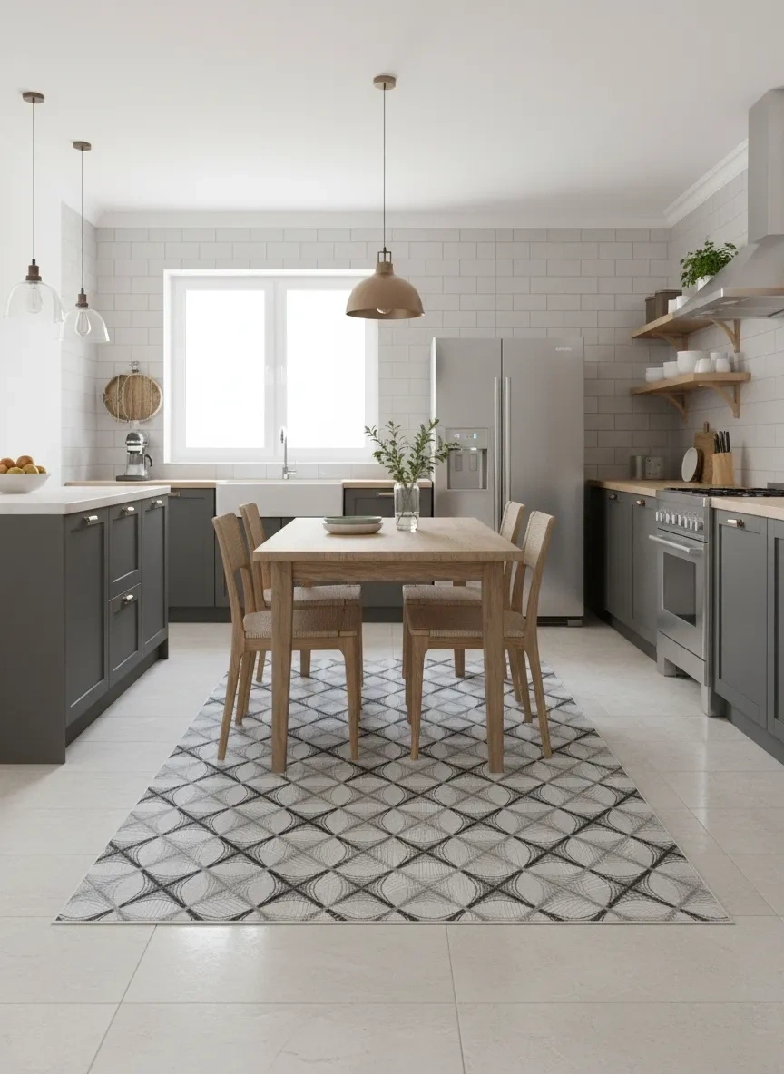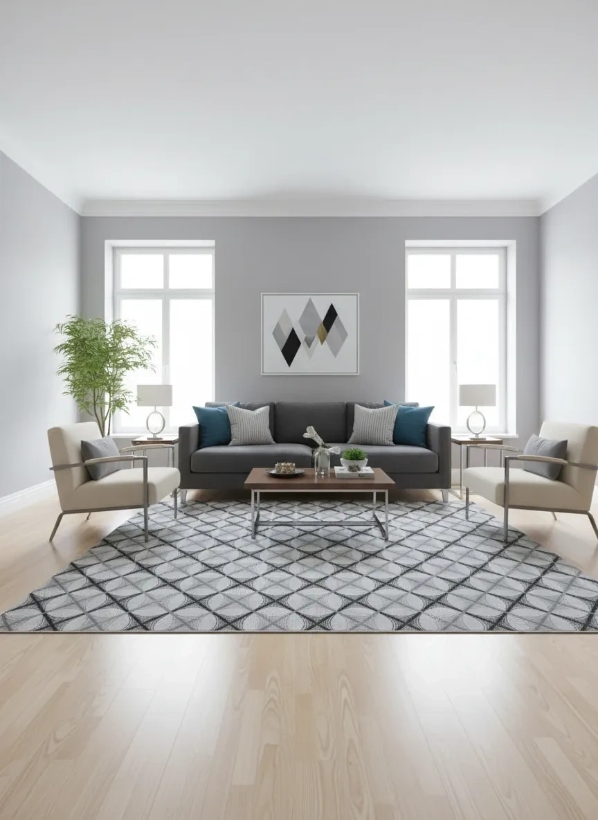 Dinarsu D017 Gri-Beyaz Büyük Baklava Halı, gri ve beyaz tonlarında büyük ölçekli baklava ve ağ formlarının güçlü bir diyagonal kompozisyon oluşturduğu çarpıcı bir tasarım sunar. Geniş baklava formlarının birbiriyle oluşturduğu ağ yapısı, özellikle büyük mekânlarda zemin tasarımını tam anlamıyla tanımlayan baskın ve özgüvenli bir zemin ifadesi yaratır. Oturma odası, yemek odası, antre, koridor ve açık plan yaşam alanları gibi her mekânda kullanılabilen bu halı, büyük ölçekli deseniyle özellikle yüksek tavanlı ve geniş alanlarda en güçlü etkisini gösterir. Gri, beyaz, siyah ve antrasit dominant dekorasyonlarda özellikle tercih edilen bu model; hem modern hem de klasik tarzda kullanılabilme esnekliği sunar. Dinarsu'nun dayanıklı makine dokuması ile bu güçlü tasarım uzun yıllar boyunca özgünlüğünü korur.