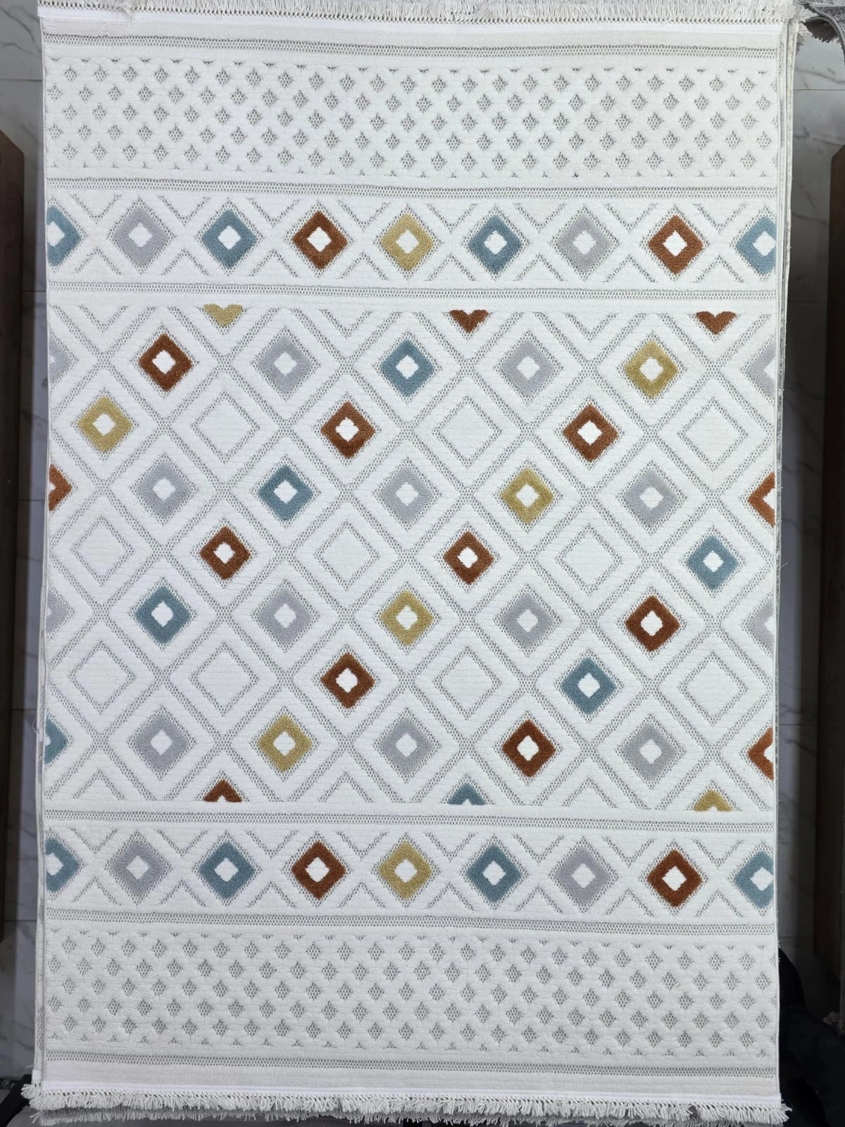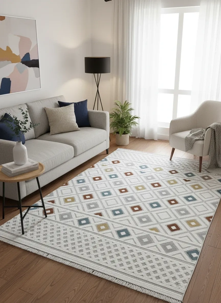 • Bu halı saçaklı yapısıyla şık bir görünüm sunar; robot süpürge dostudur, anti-alerjenik özelliği sayesinde sağlıklı bir ortam sağlar, leke tutmaz yüzeyi ile bakımı kolaydır ve makinede yıkanabilir. Excellence koleksiyonunun bu çok renkli tonlu, geometrik desenli, baklava desenli modeliyle yaşam alanlarınıza hem estetik hem işlevsel bir dokunuş katın.