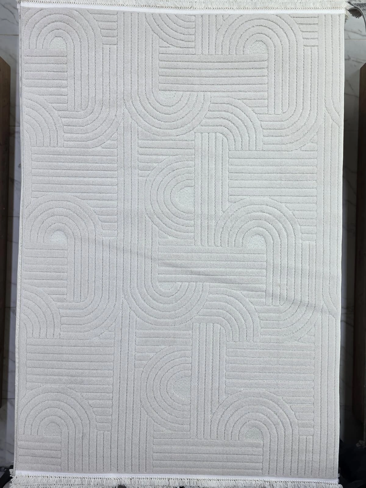 Excellence Level EN270P Bej Labirent Kıvrım Desen Salon Halısı 150x220 — Peluş Saçaklı
