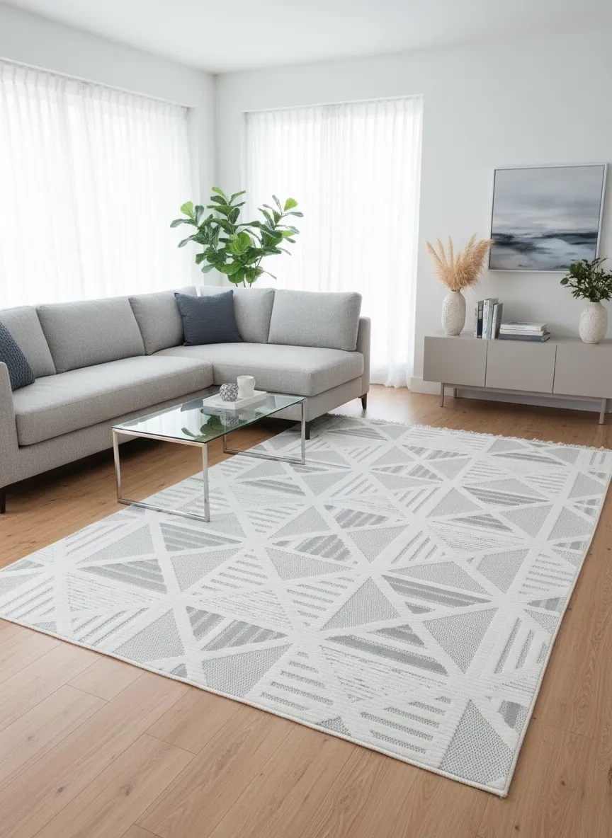 Excellence Level EN274P Krem Gri Üçgen Geometrik Salon Halısı 150x220 — İç İçe Desen Saçaklı
