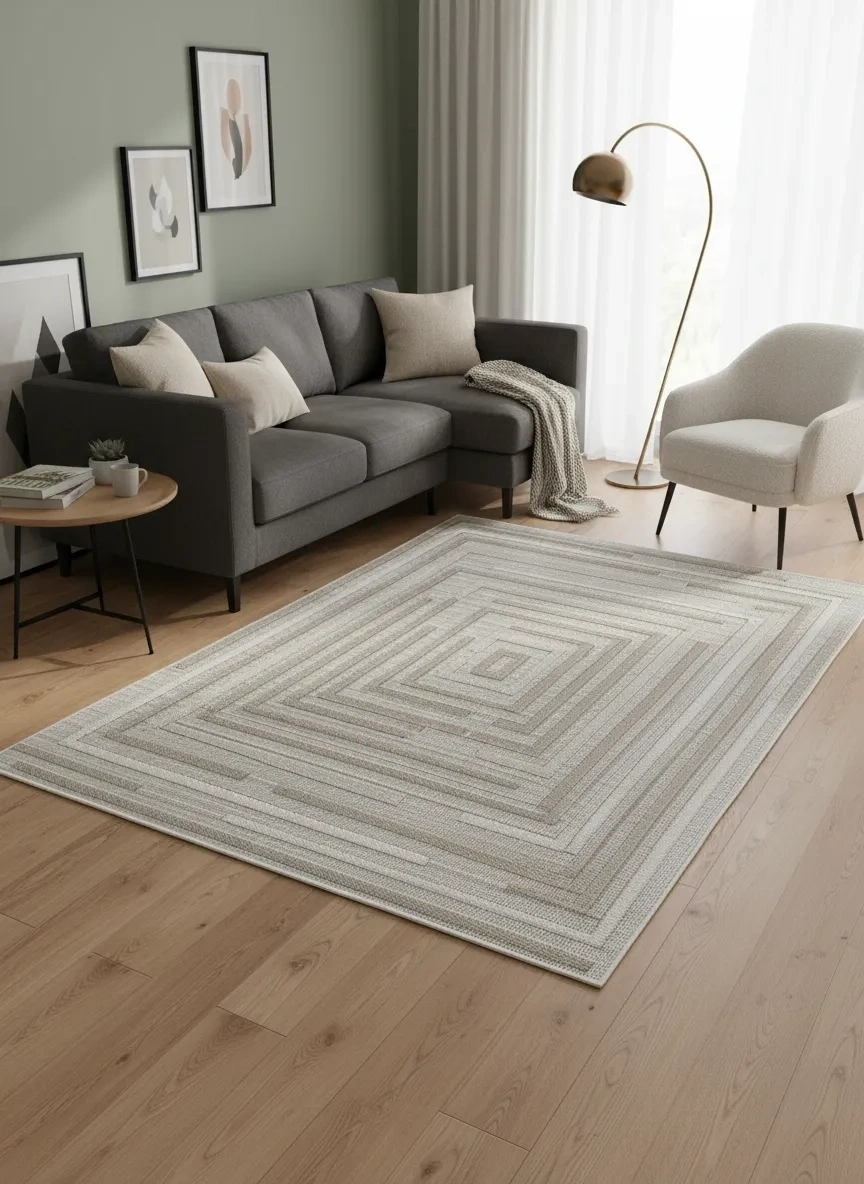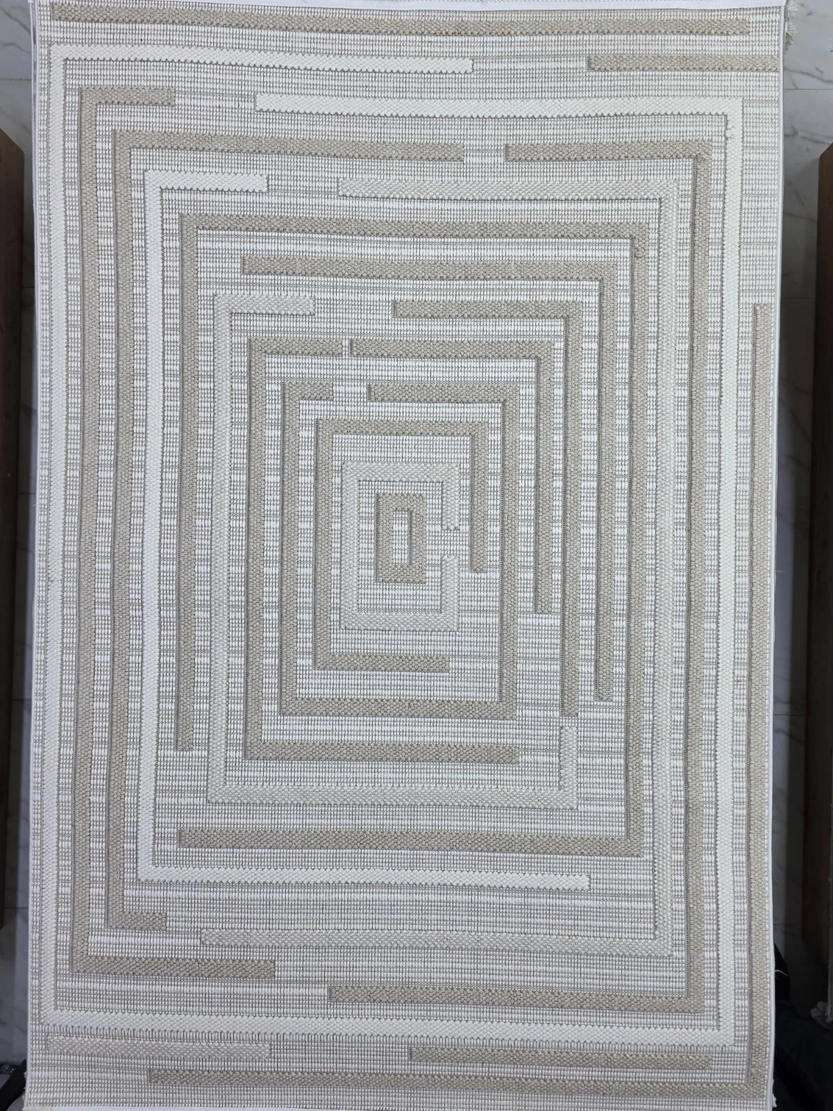 Excellence Narbe NB02 Krem Bej Spiral Labirent Salon Halısı 150x220 — İç İçe Çerçeve Saçaklı