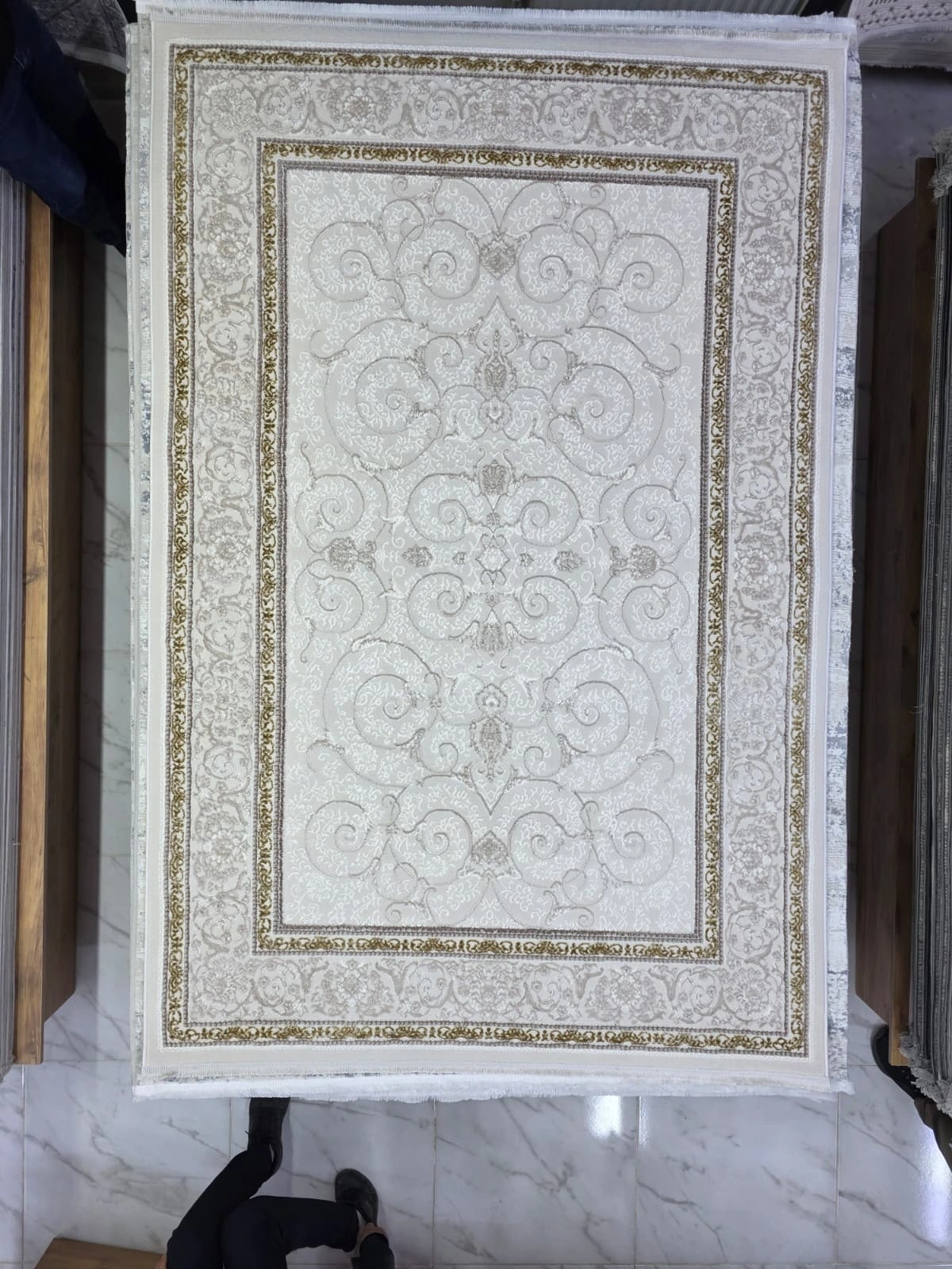 Gümüşsu 12244C Gold Halı, Türk halıcılık geleneğinin incelikli işçiliğini yansıtan klasik şal deseniyle öne çıkar. Krem zemin üzerindeki gold (altın sarısı) bordür detayları, mekânınıza sıcak ve lüks bir hava verir.