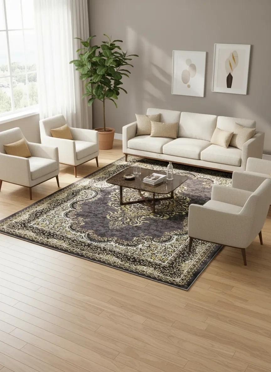 • Hereke Classic 7563F Koyu Gri-Gold modeli, derin koyu gri zemini üzerine işlenen altın-gold rengi kıvrım motifleri ve merkezdeki şatafatlı madalyonuyla çarpıcı bir kontrast yaratır. Modern ve klasik dekorasyonu bir arada seven ev sahiplerinin ilk tercihi olacak bu halı, gri halı modelleri arayanlar için eşsiz bir seçenektir. Hereke halı markasının bu özel modeli, 200x290 cm boyutuyla büyük salon ve oturma odaları için uygundur.