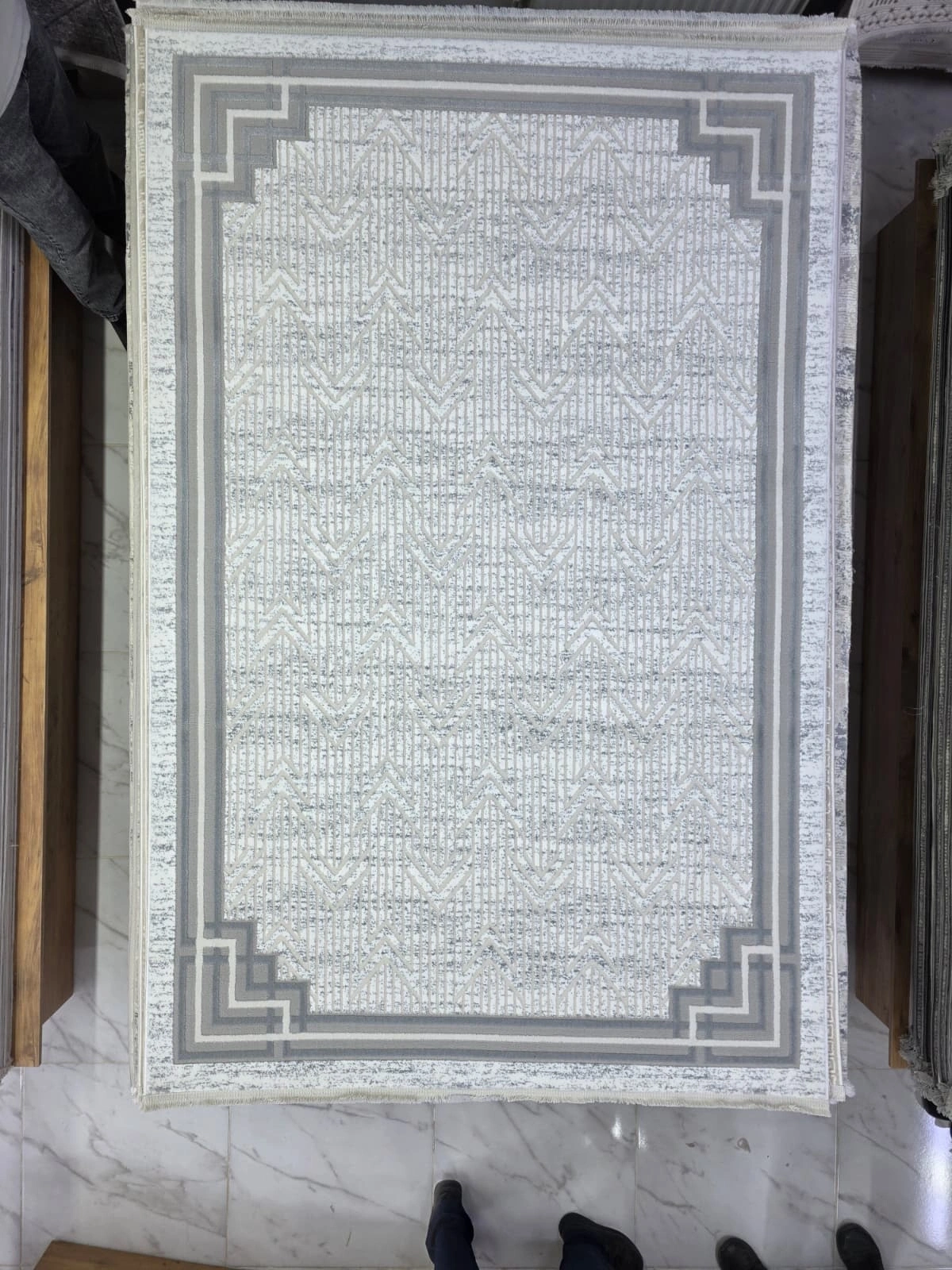 Odak İnci H5955A Gri Beyaz Halı, modern geometrik zikzak deseni ve kademeli köşe bordür detayıyla çağdaş iç mekân anlayışına mükemmel yanıt verir. Beyaz zemin üzerinde gri tonların dengeli kullanımı, mekânınızı aydınlatır ve genişletir.