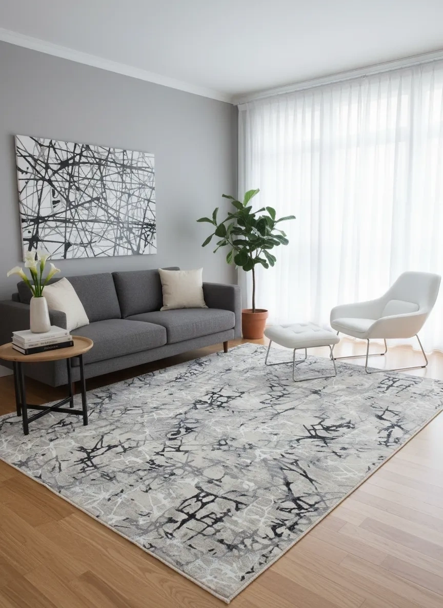 Odak İnci H6039A Lacivert-Gri Halı, beyaz zemin üzerine siyah ve gri tonlarında soyut dal ve çizik motiflerinin özgürce dağıldığı sanatsal bir kompozisyon sunar. Oturma odası, yemek odası, antre ve çalışma odası gibi evin her köşesine soyut sanat eserlerini andıran güçlü bir görsel etki katar. Soyut desen anlayışı, modern ve çağdaş iç mimari projelerinde zemin tasarımına artistik bir boyut kazandırır. Siyah, beyaz, gri dominant mekânlarda dramatik bir etki yaratırken renkli aksesuarlarla birlikte kullanıldığında dengeleyici bir zemin görevi üstlenir. 200x280 cm ölçüsü ve Odak İnci serisinin dayanıklı üretimi ile mekânınızın sanatsal zeminini uzun yıllar korur.