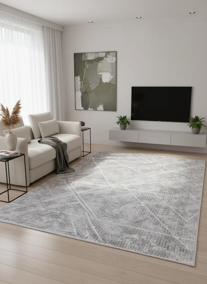 Odak İnci H7399A Gri-Beyaz Halı, beyaz zemin üzerinde gri ve açık mavi tonlarında büyük çapraz çizgi ve baklava formlarının oluşturduğu güçlü geometrik bir kompozisyon sunar. Oturma odası, yemek odası, antre ve koridor gibi evin her alanında modern ve güçlü bir zemin ifadesi yaratır. Büyük ölçekli geometrik desenler, özellikle yüksek tavanlı ve geniş mekânlarda zemin tasarımını tanımlayan güçlü bir unsur haline gelir. Bu halıdaki çapraz çizgiler, mekânı dinamik bir görsel hareketle doldurur. Gri, beyaz, antrasit ve mavi aksanlı mobilyalarla mükemmel uyum içinde çalışır. 200x280 cm ölçüsü ve Odak İnci serisinin kaliteli üretimi, uzun yıllar boyunca dayanıklı kullanım sağlar.