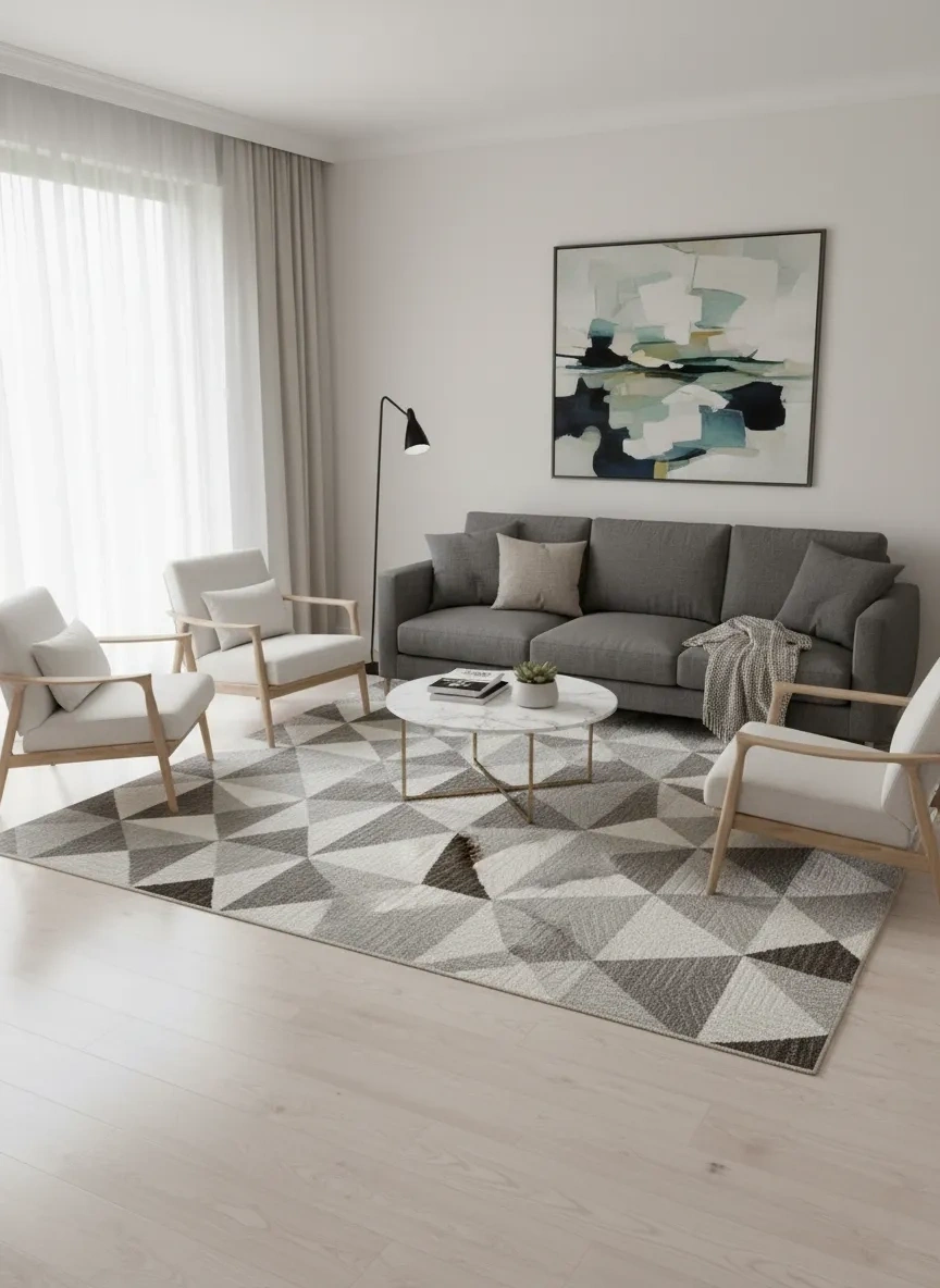 Sarar Lüx Gri Kahve Kristal Üçgen Halı, gri ve kahverengi tonlarında iç içe geçen üçgen ve kristal mozaik motifleriyle kırık buz ya da kristal yüzeyini anımsatan güçlü bir geometrik kompozisyon sunuyor. Parçalı üçgen formlarının yarattığı dinamik hareket ve ışık-gölge oyunu, salonunuzu hem görsel hem mekânsal olarak genişletici bir etki yaratıyor. Geometrik halı ve üçgen desen halı arayanlar için Türkiye'nin en özgün ve uygun fiyatlı seçeneklerinden biri olan bu model, gri-kahve renk uyumuyla endüstriyel, Scandi ve modern dekorasyonlarla mükemmel bütünleşiyor. Kristal desen halı ve mozaik halı arayanların ilk tercihlerinden biri olan bu ürün, gümüşsuyu halı ve atlas halı alternatifleri arasında öne çıkıyor. Türkiye genelinde 800 TL uygun fiyatıyla kapıya teslim edilmektedir.