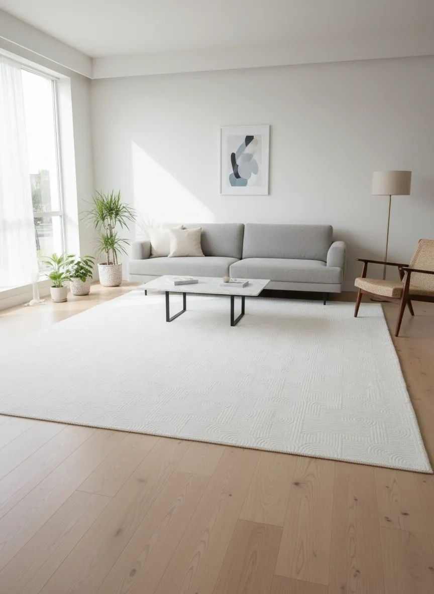 • Sarar Plus Beyaz Spiral, krem-beyaz zemin üzerinde iç içe geçen spiral ve dairesel kabartma motiflerinin oluşturduğu üç boyutlu doku efektiyle mekânınıza hem modern hem lüks bir zemin sunuyor. Yüksek kaliteli dokuma yapısı ve ışığın açısına göre değişen gölge efektiyle salonunuzun odak noktasına dönüşüyor.