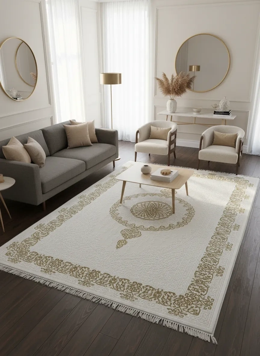 Sevimli Avanos AK095 Beyaz Gold Flosh Halı, parlak beyaz kadifemsi flosh yüzeyi üzerinde altın sarısı arabesk bordür çerçevesi ve merkezdeki nefis lotus madalyon kompozisyonuyla lüks halı kategorisinin tartışmasız gözdelerinden biri. Altın sarısının beyaz zemin üzerindeki ışıltılı kontrastı, flosh yüzeyin ışığa duyarlı parlaklığıyla birleşince mekânınıza 5 yıldızlı otel lobisi ve saray salonu atmosferi kazandırıyor. Beyaz gold halı ve flosh halı arayanlar için Türkiye'nin en prestijli seçeneklerinden biri olan bu model, düğün salonları, lüks konutlar ve premium otel projeleri için biçilmiş kaftan. İpek görünümlü halı ve hereke halı estetiğini arayan seçici müşterilere mükemmel bir alternatif sunan bu ürün, gümüşsuyu halı, atlas halı ve royal halı seviyesinde kaliteye sahip. En iyi halı markaları arasında gösterilen Sevimli Avanos koleksiyonunun bu özel flosh modeli, 160x230 cm boyutuyla geniş salon ve oturma odaları için ideal olup Türkiye genelinde uygun halı fiyatıyla kapıya teslim edilmektedir.