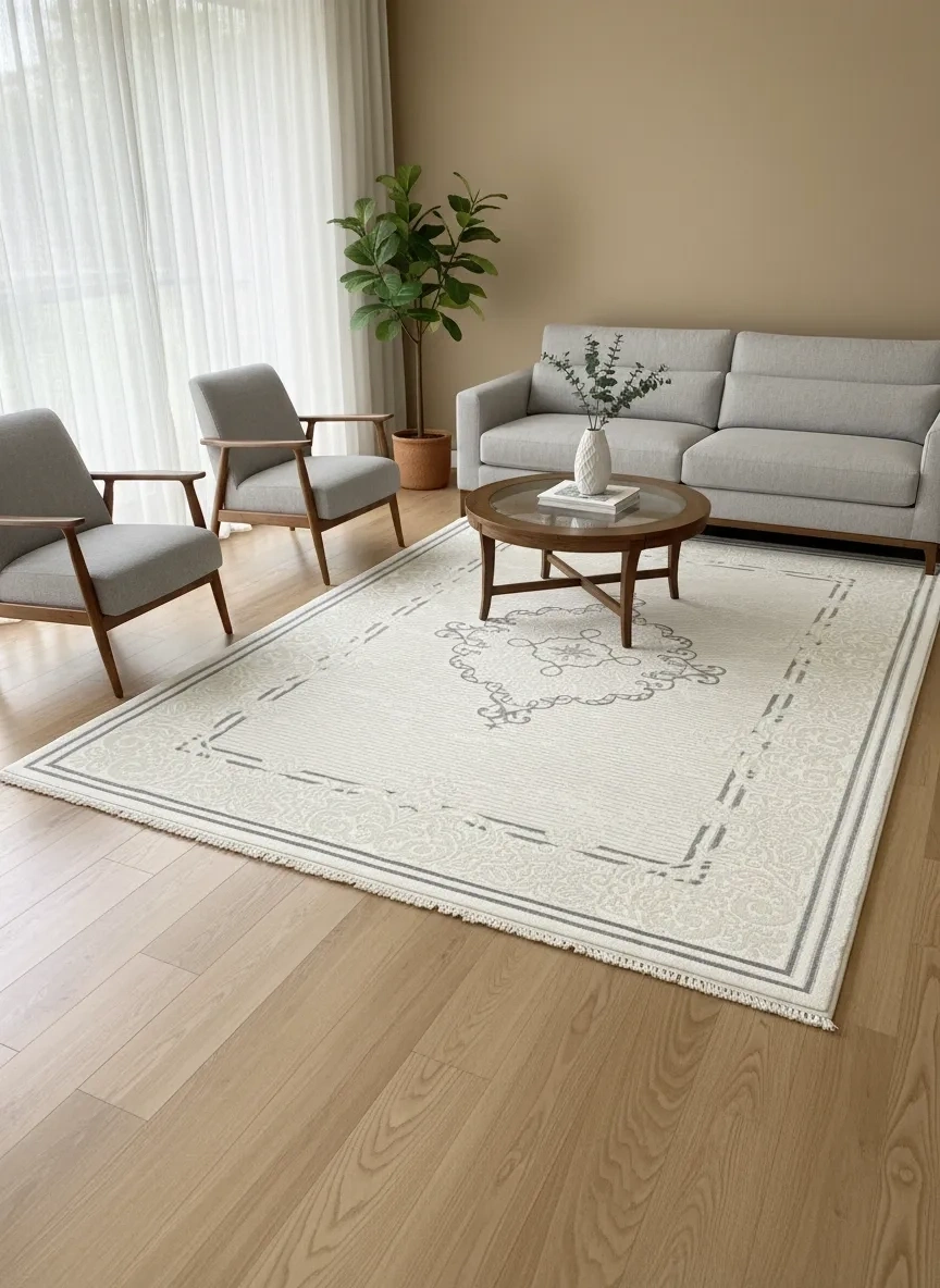 • Sevimli Avanos AK121, beyaz-krem flosh çizgili yüzey üzerinde gri elmas madalyon ve ince gri bordür çerçevesiyle minimalist lüksü en zarif biçimde sunan premium bir salon halısı. Sade gri-beyaz renk uyumunun sakinleştirici etkisi ve flosh yüzeyin ışıltısıyla her tür mobilya ve dekorasyona mükemmel uyum sağlayan bu model, 160x230 cm boyutuyla büyük salonlar için ideal.